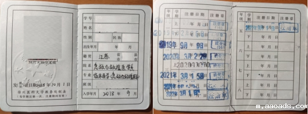 学生证中个人信息页(有照片、学制、专业、入学年月等信息)和注册页照片