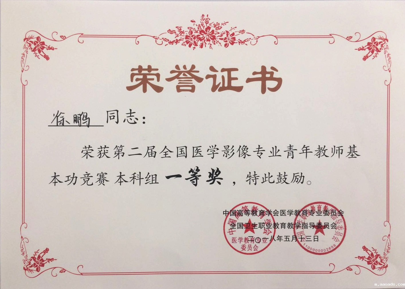 经过激烈角逐,我校医学影像学院影像诊断教研室青年教师徐鹏凭科学严谨的教案设计、形象生动的教具、启发式的互动教学和充满激情的讲解,赢得了专家评委、学生评委及观摩高校教师的一致好评,最终荣获本科组一等奖及优秀教案奖。徐鹏老师在全国大赛的获奖为学校赢得了荣誉,在全国医学影像界充分展示了医学影像学院青年教师扎实的教学功底和先进的教学理念。