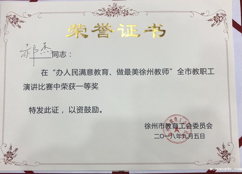 为庆祝第34个教师节,进一步贯彻落实党的十九大和习近平总书记系列重要讲话精神,贯彻落实《中共中央国务院关于全面深化新时代教师队伍建设改革的意见》精神,大力推进师德师风建设,大力弘扬劳模精神和工匠精神,9月6日,徐州市总工会教育工会关举办了“办人民满意教育、做最美徐州教师”全市教职工演讲比赛,经层层选拔,校工会推荐郝杰老师参加决赛并喜获一等奖。