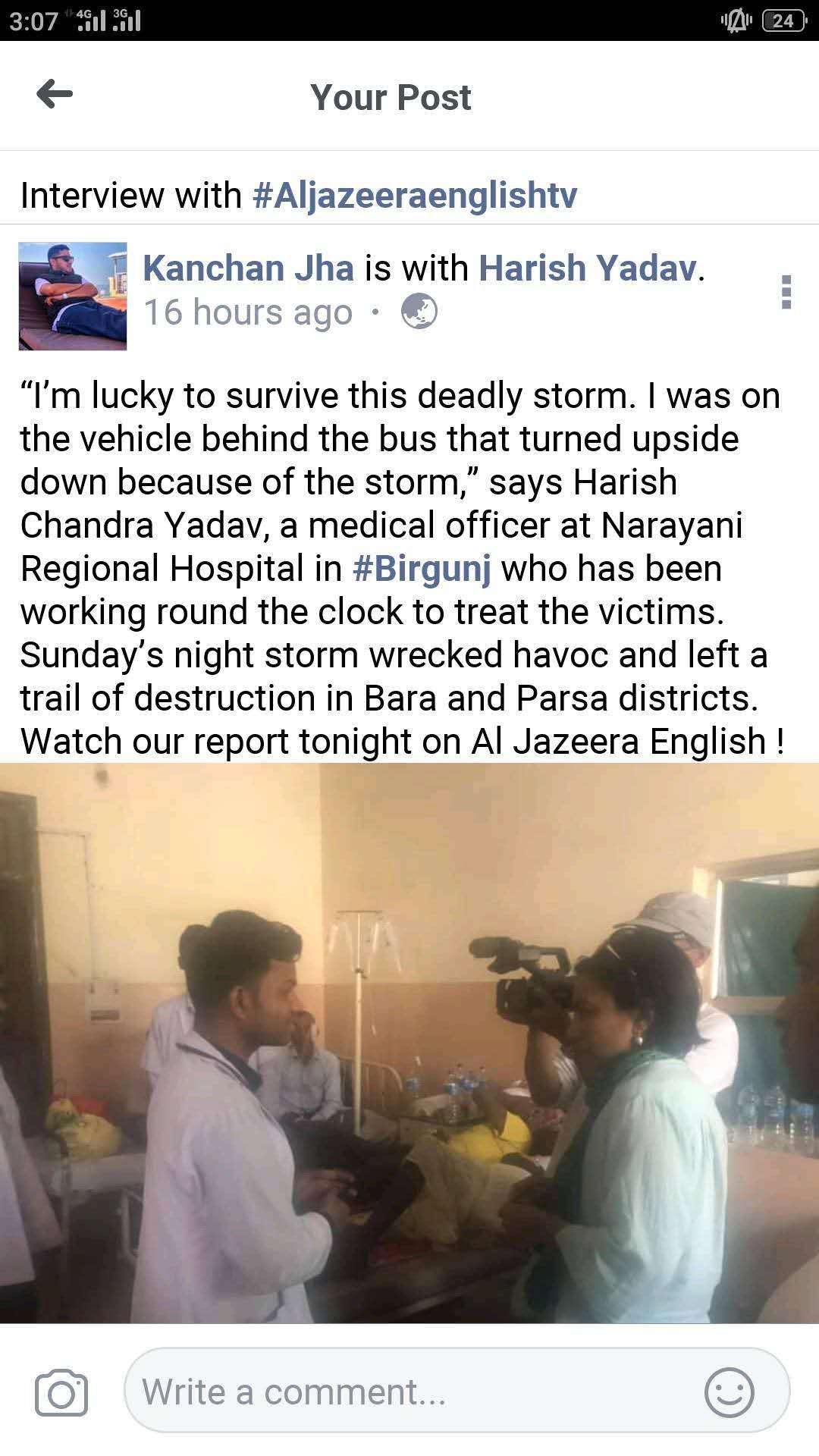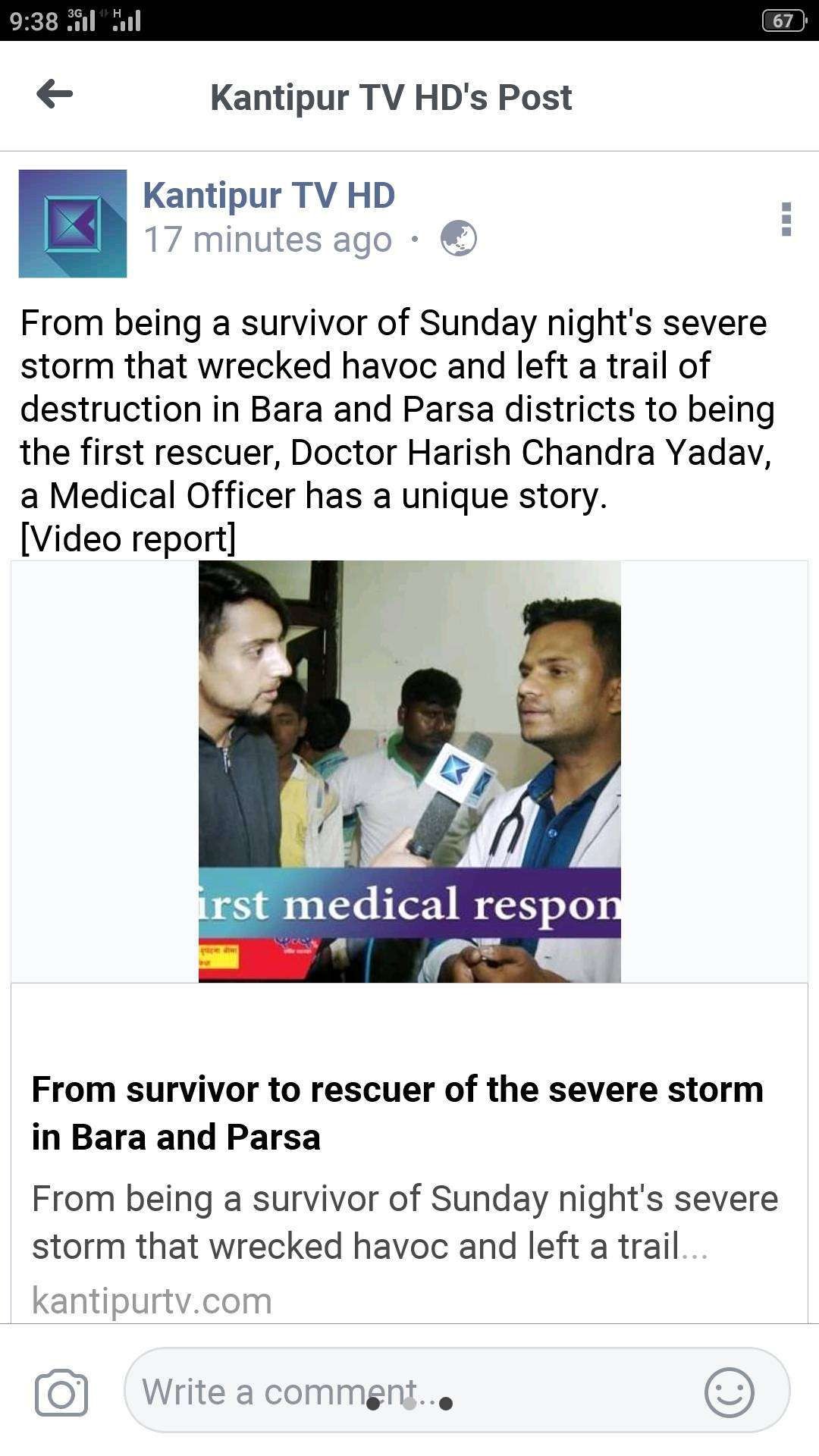 3月31日,Harishchandra Kumar Yadav在从加德满都回家途中,突遇暴风雨,风暴造成大批房屋倒塌,数十人死亡,大批人受伤。当行驶在他前面的一辆公共汽车被掀翻时,Harish临危不惧,沉着应对。他首先打电话叫来救护车,然后对伤者进行心肺复苏等紧急救助。在随后的几天里,他又作为志愿者留在灾区,为灾民提供免费药品并诊治。Harish的爱心和英勇行为受到了当地居民和地方政府的一致褒奖。为此,他还接受了面向全球的国际性媒体Al Jazeera(半岛电视台)、尼泊尔最大电台Kantipur TV(康提普电台)等多家媒体的采访。