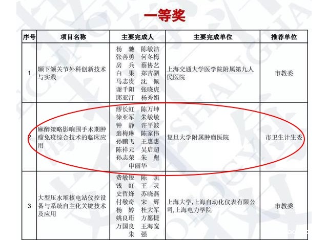 2018年度上海市科学技术奖励大会5月15日上午召开,隆重表彰为上海科技创新事业和经济社会发展作出突出贡献的科技工作者。我校1987届校友,复旦大学附属肿瘤医院麻醉科、ICU主任缪长虹教授团队领衔完成的研究项目《麻醉策略影响围手术期肿瘤免疫综合技术的临床应用》荣获上海市科技进步一等奖。