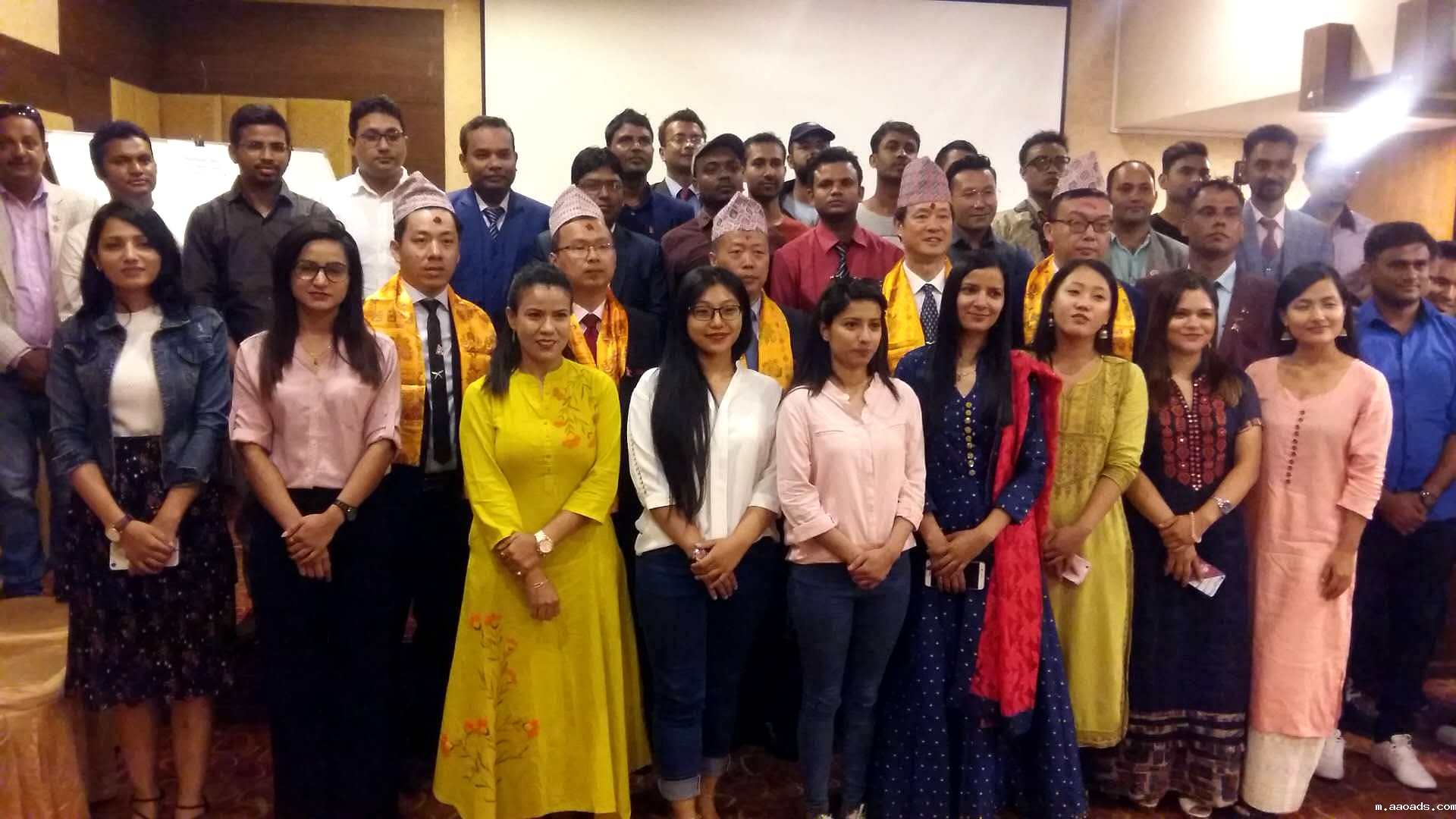 李海洋秘书长宣读尼泊尔校友会会长、副会长、秘书长及副秘书长候选人名单。吴永平理事长为当选的校友们颁发聘书,并与校友会会长Abhimanyu Chand代表双方互赠礼品。