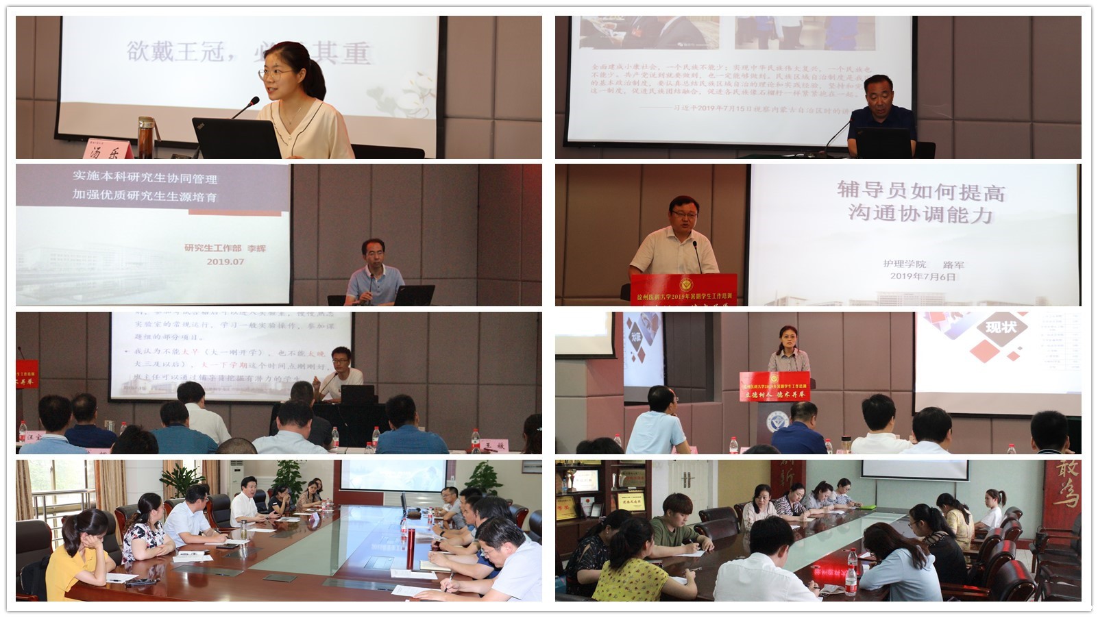 南京师范大学汤乐老师以自身从事辅导员对学生关爱与真心出发,叙述了一个优秀辅导员的成长历程;公共卫生学院党委副书记卜庆亮以预防专业为例,详细分析了公卫学院的学风现状,并提出了具体的原因与改进措施;医学信息与工程学院党总支副书记谢广明以自身从事大学生就业与指导工作的经验,讲述了辅导员如何指导大学生职业生涯规划;麻醉学院党委书记丛宁以麻醉学院学生工作的特色为例,介绍了学生工作家校共建的方式、效果与心得;公共卫生学院班主任黄叶飞老师介绍了班主任在学生专业教育与科学研究思维形成中的创新举措;第一临床学院党委副书记姜嘉讲述了如何在大学生学业预警上做到精细化管理;研究生工作部部长李辉从研招生源与学校政策出发,提出了如何做好落实本科研究生协同管理、加强优质生源培育;保卫处处长刘建海介绍了民族宗教知识,阐述了做好民族学生工作的目标、方法与意义;生命科学学院党总支副书记葛媛媛就毕业生学位授予率的问题,介绍了学位授予的政策及生命科学学院大量的细致与严谨的工作;护理学院党委副书记路军针对辅导员如何提高沟通协调能力作了精彩的报告。