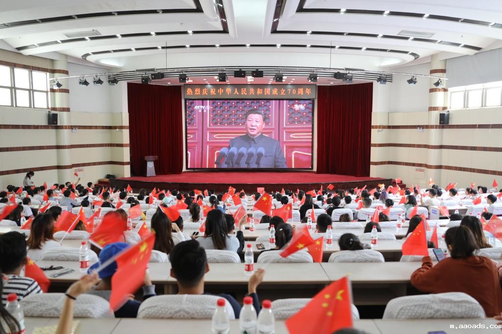 10月1日上午10时,庆祝中华人民共和国成立70周年大会、阅兵式、群众游行在北京天安门广场隆重举行,我校组织假期留校师生在学术报告厅集中观看盛况直播。为进一步加强青年学生对中国共产党党史、中华人民共和国国史的了解,在阅兵仪式开始前组织开展了爱国、爱党互动知识竞赛,学生们竞相举手,踊跃参与,现场气氛热烈。随后,师生们挥舞红旗,满怀激情,集体高唱《我和我的祖国》,共同祝福新中国七十华诞。当阅兵仪式开始,伴随直播中“全体起立”口令,师生们自觉站起,并随音符齐唱国歌。规模盛大的阅兵式和展示新中国70年伟大发展成就的群众游行联欢活动令师生们振奋万分、热血沸腾,他们时而热泪盈眶,时而报以掌声。学生们纷纷表示,气势磅礴的阅兵式展示出了中国军队的强大和祖国的繁荣强盛,作为青年学生,誓要励志图强、奋发有为,担负起时代赋予的光荣使命,为实现中华民族伟大复兴的中国梦贡献青春和力量。