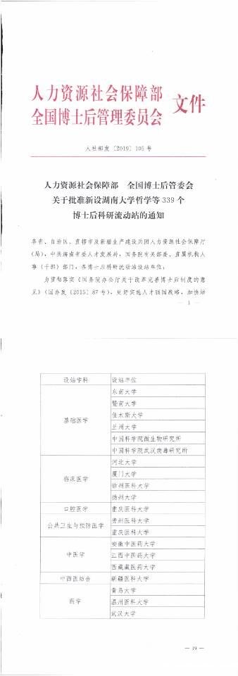 近日,人力资源社会保障部、全国博士后管委会联合下发《关于批准新设湖南大学哲学等339个博士后科研流动站的通知》(人社部发〔2019〕105号),经全国博士后管委会专家组评审,人力资源社会保障部、全国博士后管委会研究决定,批准我校临床医学一级学科设立博士后科研流动站,这是继2014年9月我校首次设立生物学博士后科研流动站后,学校在学科建设和高层次人才队伍建设取得的又一重大突破。