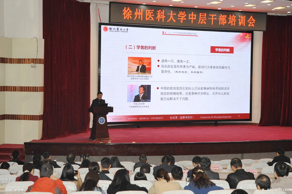 王峰书记为以“新时期党风廉政建设新思想新方略”为题,为在场干部作培训。他结合典型的案例事件,分析了十八大前后的反腐败形势,深入解读了十八大以来党风廉政建设新思想新方略、以及当前高校(附属医院)党风廉政建设新精神新要求。他希望广大干部“认识再深刻”、 “履责再尽责”、“ 自警再自省”,做到“有纪律、讲规矩、守底线、肯担当! ”