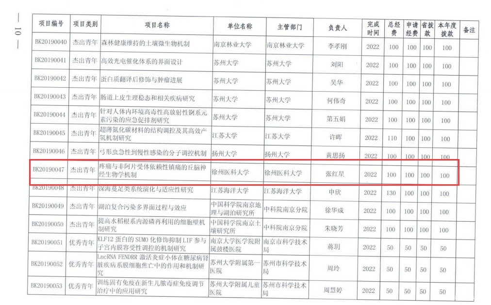 近日,江苏省财政厅、江苏省科学技术厅联合下发《关于下达2019年省基础研究计划(自然科学基金)专项资金的通知》(苏财教〔2019〕110号),公布了2019年省基础研究计划(自然科学基金)项目及经费情况,其中共有50位杰出青年科研人员入选,伟德客户端下载安装手机版麻醉学院张红星教授名列其一。张红星教授项目名称为“疼痛与非阿片受体依赖性镇痛的丘脑神经生物学机制”,项目编号为BK20190047,项目直接经费100万元。该项目实现了我校在江苏省杰出青年基金项目申报上零的突破。