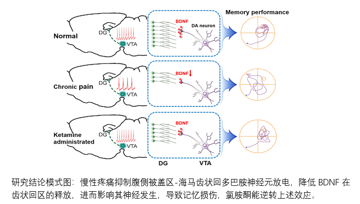 慢性疼痛并发精神系统疾病已成为严重危害人类健康的临床病症之一。以往研究发现大部分慢性疼痛患者都存在不同程度的记忆力减退,这不仅严重影响患者日常的工作生活,也给家庭、社会带来了沉重的负担。因此,研究慢性疼痛状态下,记忆相关神经环路的病理性改变以及相应的治疗策略显得尤为重要。本研究以成年海马齿状回神经发生为切入点,综合利用离体投射特异性电生理记录、化学遗传学、条件性基因敲除、神经药理学等神经科学技术,在慢性坐骨神经结扎引起的神经病理性疼痛模型上,从神经环路,细胞,分子三个层面系统阐明了慢性疼痛状态下记忆损伤是由于中脑奖赏系统中的腹侧被盖区-海马齿状回投射特异性的多巴胺神经元兴奋性减少所致脑源性神经营养因子释放减少进而导致海马齿状回神经发生异常的一系列病理过程。不仅如此,该研究还利用所发现的记忆相关神经环路机制,发现了经典麻醉药物氯胺酮可缓解慢性疼痛所致记忆损伤,该研究为慢性疼痛伴记忆损伤患者的临床治疗提供了重要依据。