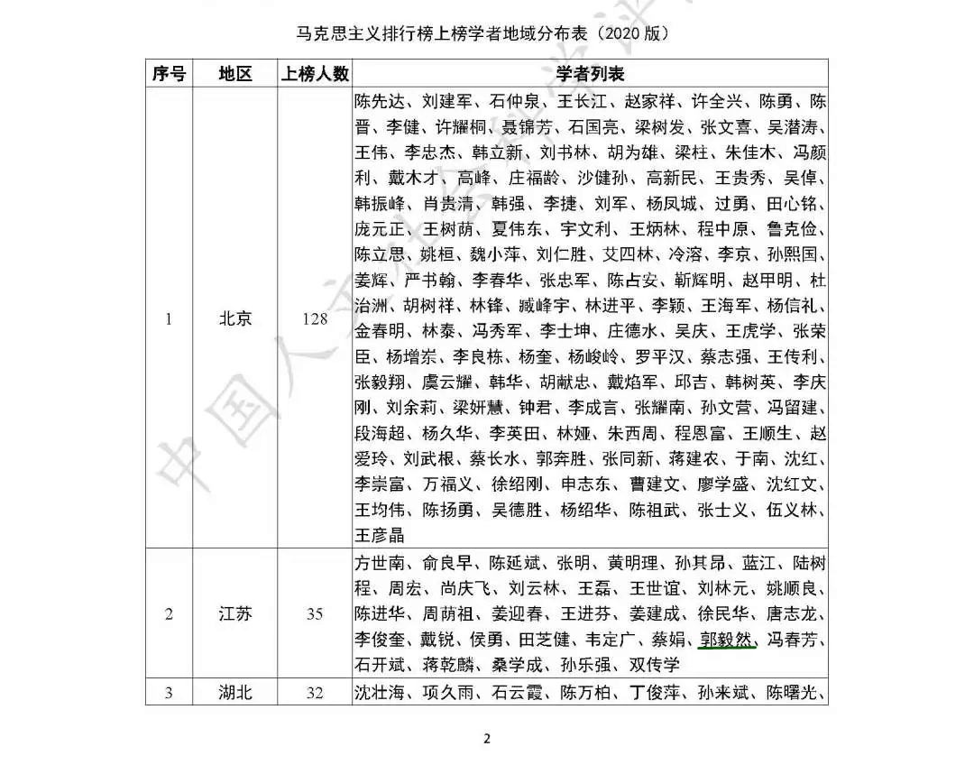 马克思主义一级学科共包含3个二级学科,分别是马克思主义、思想政治教育和中国共产党。排行榜以马克思主义所包含二级学科的数量为主、学者被引平均数为辅,确定了100位学者入选2020年马克思主义一级学科排行榜,379位学者入选马克思主义各二级学科排行榜。我校郭毅然教授入选,彰显了学校思想政治教育二级学科的学术研究水平与影响力。