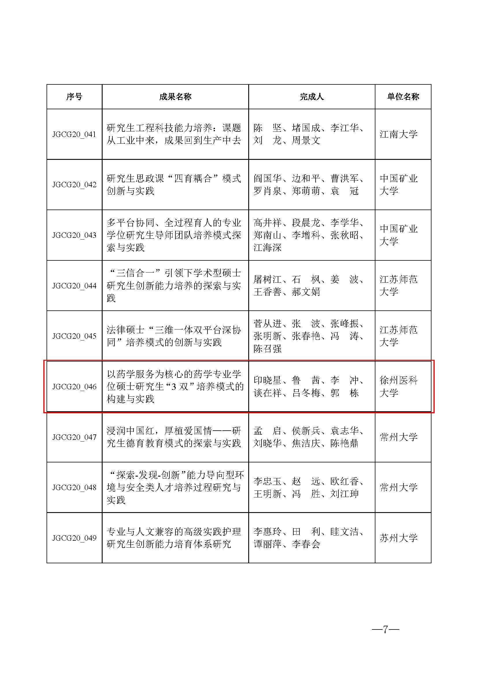 近日,江苏省研究生教育指导委员会下发《关于公布2020年江苏省研究生教育改革成果评选结果的通知》,经专家材料评审、复评答辩等多重环节,我校周芳教授团队申报的《麻醉护理专业学位硕士教育与专科护士培训有机融合培养模式的创新与实践》项目荣获二等奖,印晓星教授团队申报的《以药学服务为核心的药学专业学位研究生“3双”培养模式的构建与实践》项目荣获优秀奖。