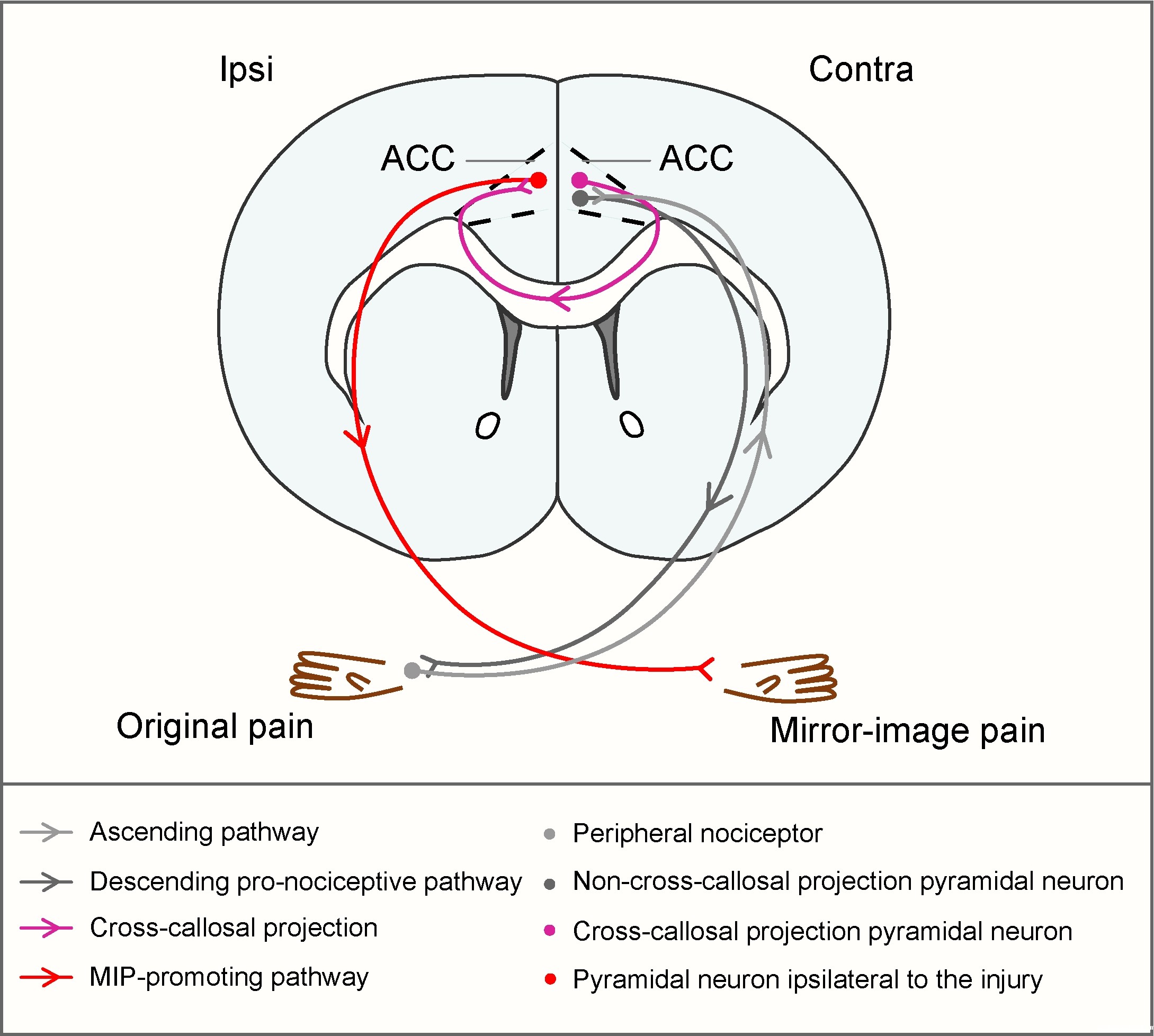 镜像痛是一种与实际损伤或发炎部位相对的完整躯体疼痛敏感性增加的现象,常见于部分慢性疼痛患者。研究提示中枢敏化可能是镜像痛的始动因素,但中枢敏化参与原发痛传递到对侧引起镜像痛的具体机制仍不清楚。本研究以前扣带回皮质为切入点,综合利用化学遗传学、环路特异性细胞毁损、神经示踪和基于cre-off的神经调控等神经科学技术,在慢性坐骨神经结扎引起的神经病理性疼痛模型上,系统阐明了前扣带回皮质锥体神经元中存在一部分群体向对侧前扣带回皮质发出跨胼胝体投射;在慢性疼痛状态下,原发痛对侧前扣带回皮质中跨胼胝体投射的锥体神经元调控镜像痛,但不影响原发痛;非跨胼胝体投射的锥体神经元调控原发痛,但不影响镜像痛。这一发现将对慢性疼痛并发镜像痛中枢机制的研究具有重要意义。