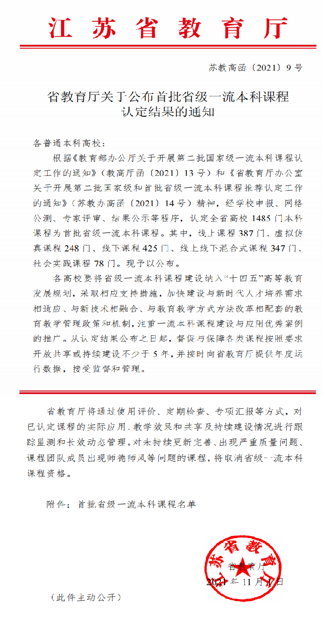 近日,江苏省教育厅发布了《省教育厅关于公布首批省级一流本科课程认定结果的通知》,我校《基础护理学》等24门课程获评首批省级一流本科课程,其中线上一流课程7门、线下一流课程8门、线上线下混合式一流课程3门、虚拟仿真实验教学一流课程4门、社会实践一流课程2门。