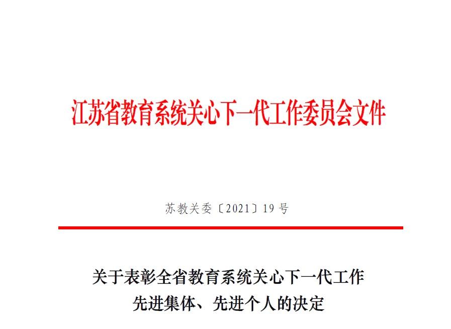 近日,江苏省关心下一代工作委员会、江苏省精神文明建设指导委员会办公室联合下发《关于表扬全省关心下一代工作优秀集体和优秀个人的通报》,江苏省教育系统关心下一代工作委员会下发《关于表彰全省教育系统关心下一代工作先进集体和先进个人的决定》,我校关工委喜获多项省级表彰。学校关工委荣获“江苏省教育系统关心下一代工作先进集体”荣誉称号,王勇同志荣获“江苏省关心下一代工作先进个人”荣誉称号,朱元业同志荣获“江苏省教育系统关心下一代工作先进个人”荣誉称号。