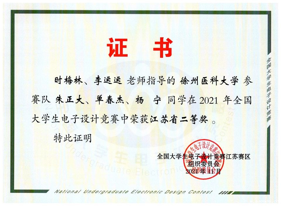近日,2021年“TI杯”第十五届全国大学生电子设计竞赛成功举办,由时梅林、李运运两位老师指导,医学影像学院生物医学工程专业朱正大、单春杰、杨宁同学组成的三人参赛队设计的作品“智能送药小车”荣获江苏省二等奖。