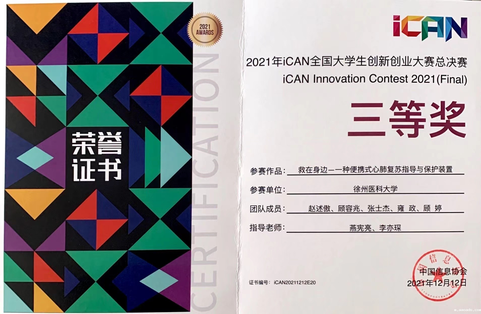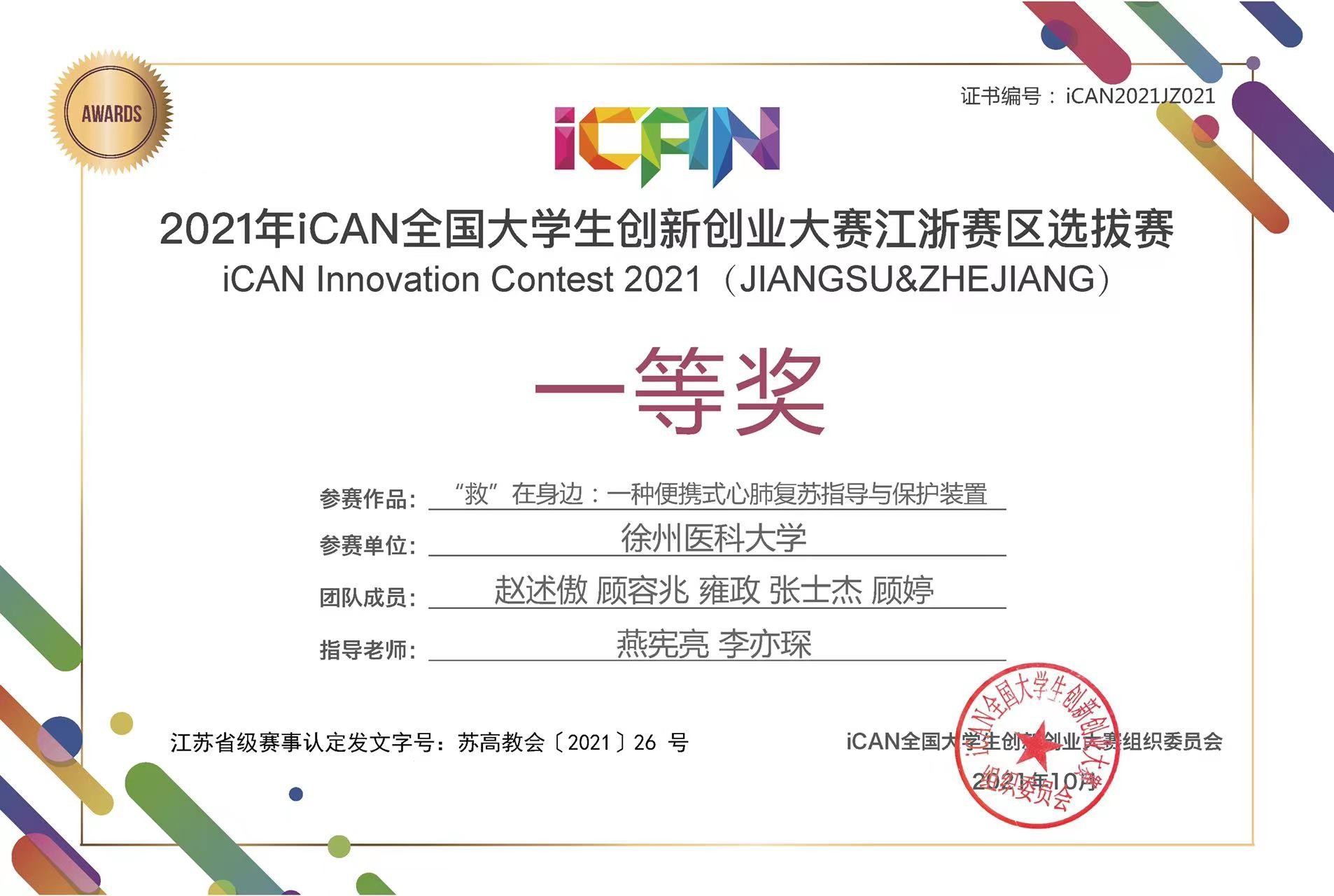 近日,2021年iCAN全国大学生创新创业大赛成功举办。我校《救在身边——一种便携式心肺复苏指导与保护装置》项目荣获全国总决赛三等奖、江浙赛区总决赛一等奖。