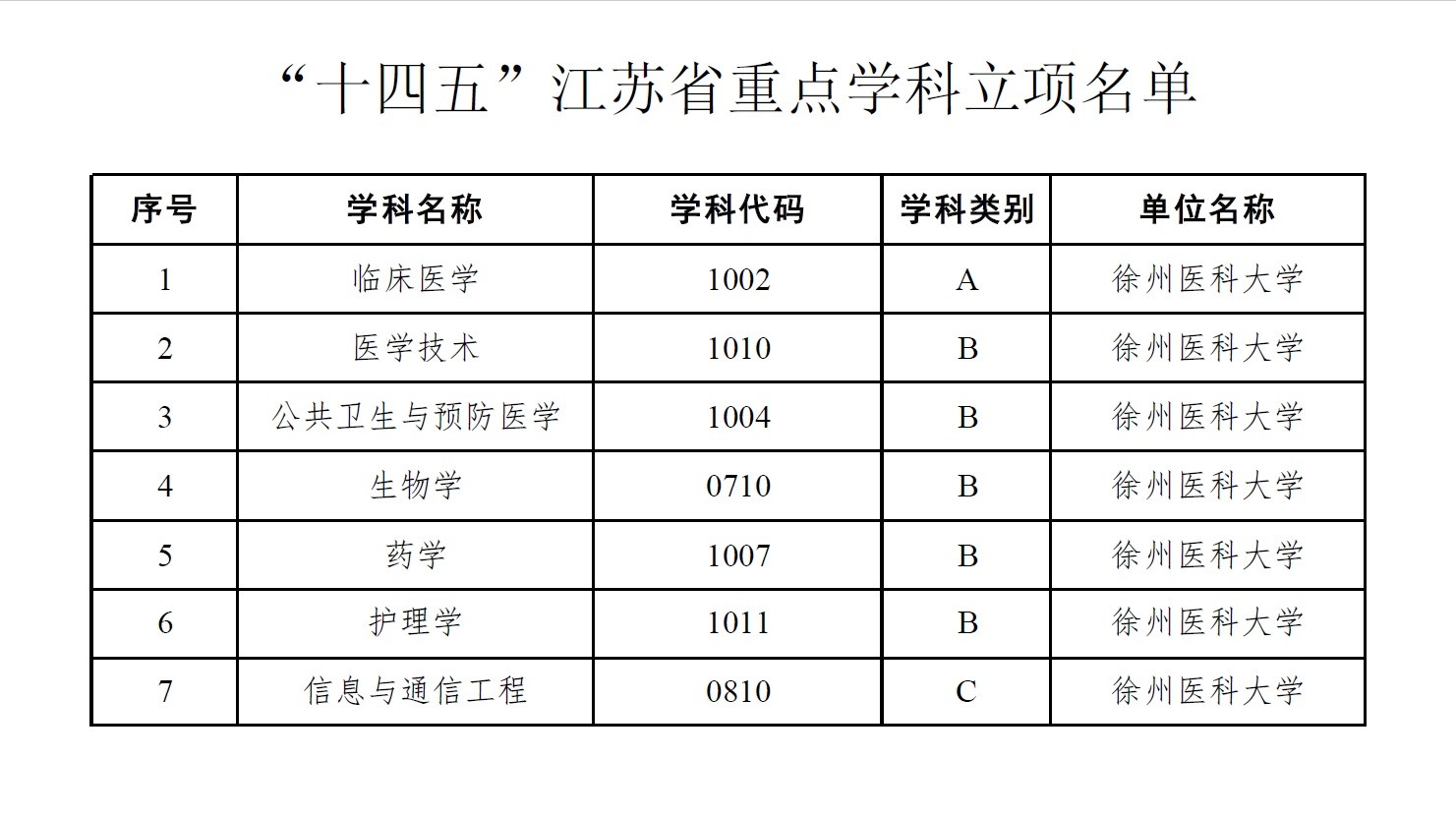 近日,江苏省教育厅公布了“十四五”省重点学科名单,我校7个学科入选,分别为临床医学、医学技术、公共卫生与预防医学、生物学、药学、护理学和电子信息(依托信息与通信工程一级学科申报),入选学科数在遴选总数不变的情况下较“十三五”增长130%,是继月初学校ESI学科取得新突破以来,在学科建设上取得的又一可喜成绩。