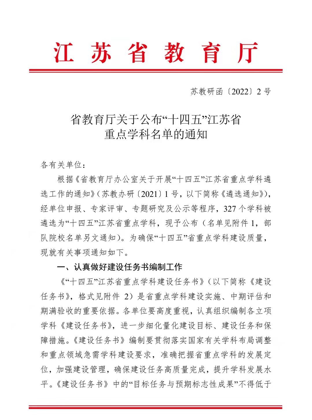 江苏省重点学科是江苏省四级学科体系(江苏高校世界一流建设学科、江苏高校优势学科、省重点学科和校特色学科)的重要基石,是培养高层次人才、集聚优秀学术团队、开展科学研究和服务经济社会发展的重要载体,对服务国家重大战略需求和江苏“十四五”经济社会发展具有重大战略意义。