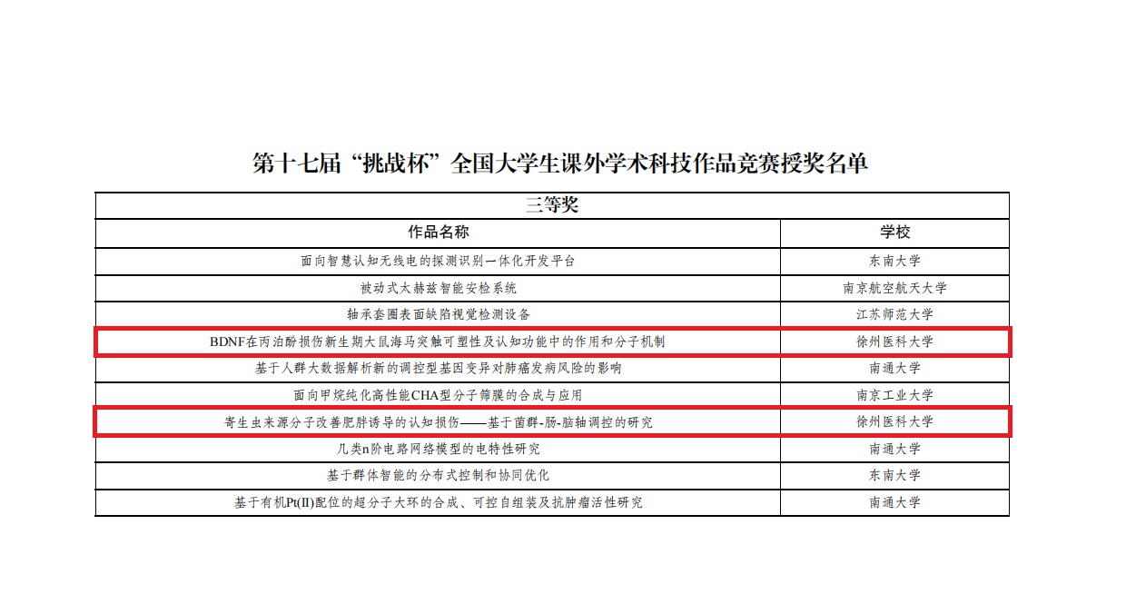 校团委于2019年11月启动本届竞赛的备赛工作,相关职能部门和学院齐心协力、共同推进,共推荐8件作品参加省级竞赛。经过激烈角逐,麻醉学院《BDNF在丙泊酚损伤新生期大鼠海马突触可塑性及认知功能中的作用和分子机制》(指导老师:武玉清,项目成员:万杰、马琳慧、肖凌云、沈诗、孙寅莹)和第一临床医学院《寄生虫来源分子改善肥胖诱导的认知损伤-基于菌群-肠-脑轴调控的研究》(指导老师:潘伟、杨晓莹、孙芬芬,项目成员:陆阳、朱宇琪、吴佳诚、刘佳雪、戴梦玉、徐雯、钱心玉、罗天成)2个项目从省赛中脱颖而出,顺利推报国赛,均荣获三等奖。
