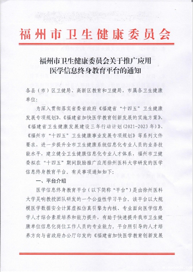 福州市卫健委高度重视全市医学信息教育和医学专业人才队伍建设,并积极贯彻落实福建省委省政府关于《福建省“十四五”卫生健康发展专项规划》《福建省加快医学教育创新发展的实施方案》《福建省卫生健康发展建设三年行动计划(2021-2023年)》等系列文件重要指示,始终将提升全市卫生健康系统信息化专业人员的业务技能水平、建立健全卫生健康信息化专业人才体系等工作落到实处。本次在全市发文推广使用医学信息终身教育平台即为落实省委省政府系列文件精神和有关要求的有力举措。