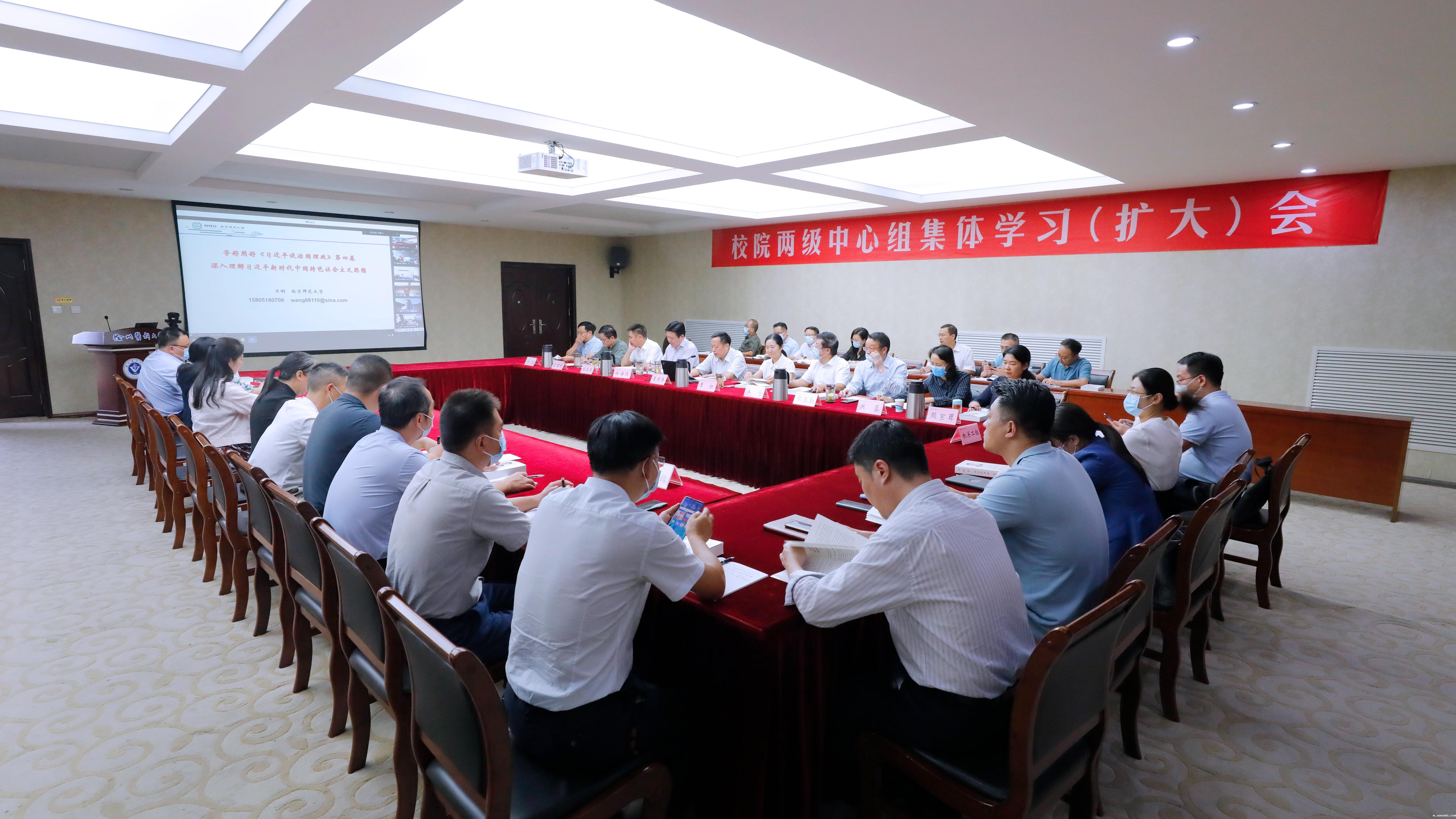9月30日下午,学校召开校院两级党委理论学习中心组集中学习(扩大)会,邀请南京师范大学马克思主义学院院长王刚教授作《习近平谈治国理政》第四卷专题辅导报告。校党委书记夏有兵主持学习。