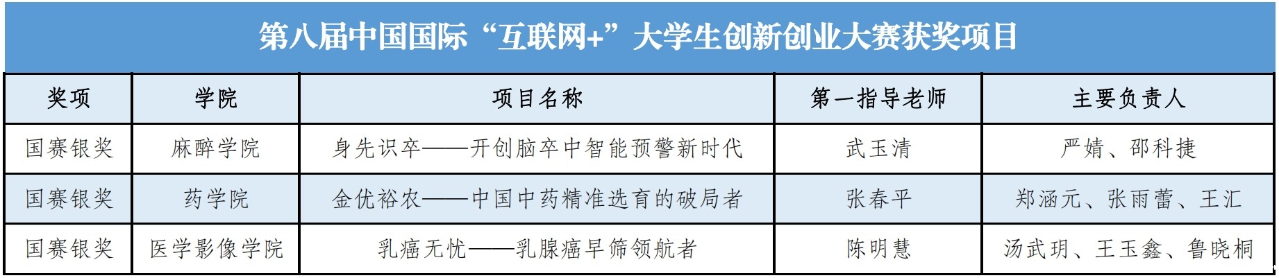 11月10至13日,由教育部等12个中央部委单位和重庆市人民政府共同主办,重庆大学承办的第八届中国国际“互联网+”大学生创新创业大赛全国总决赛在线上举行。经过激烈角逐,来自我校麻醉学院、药学院、医学影像学院的3个项目团队在大赛中荣获国赛银奖。