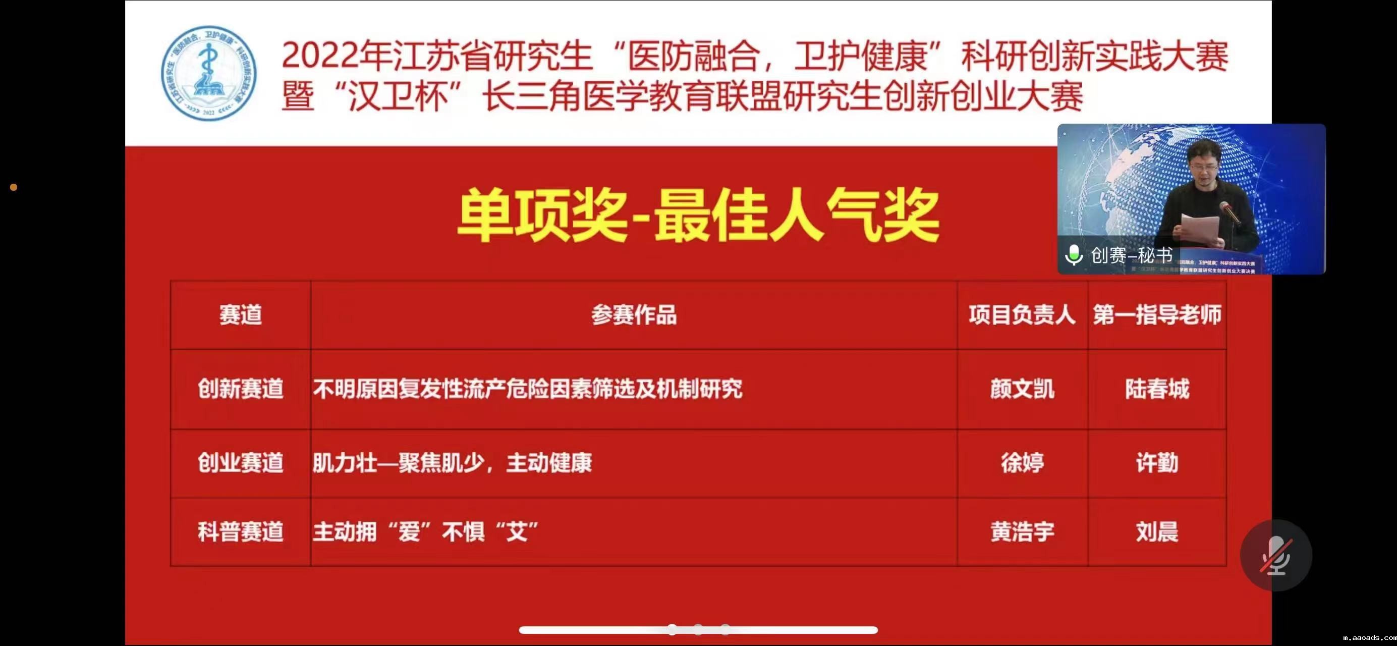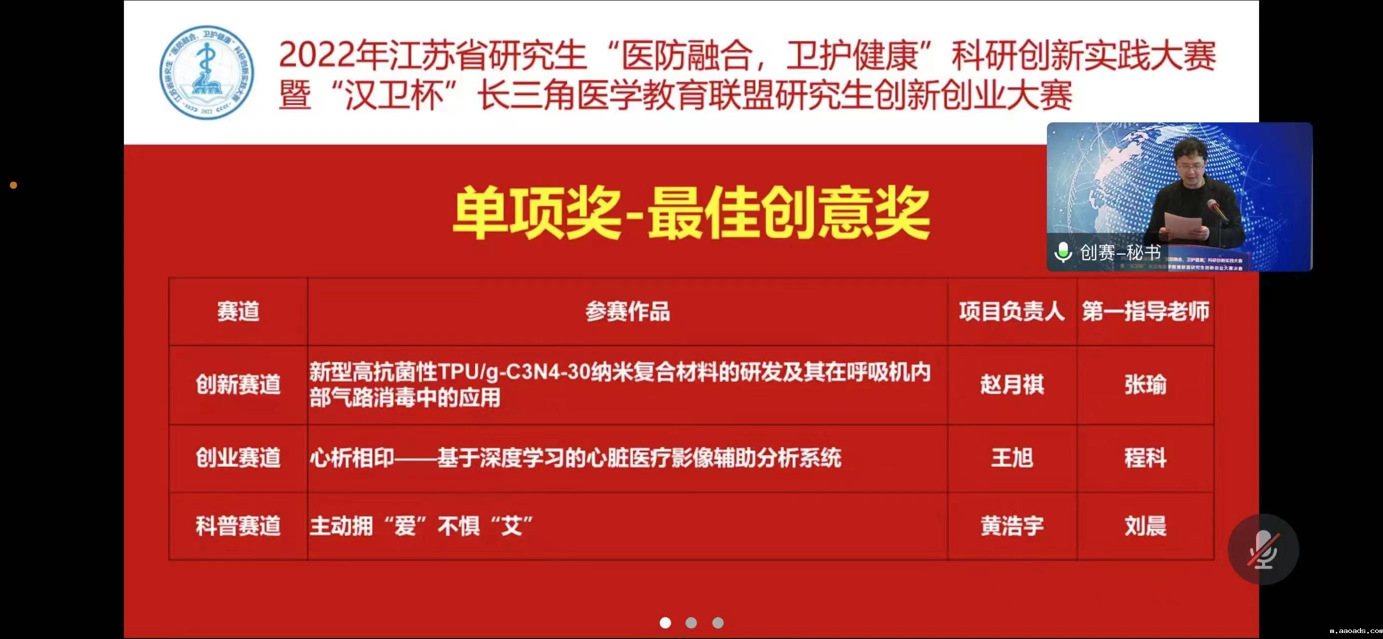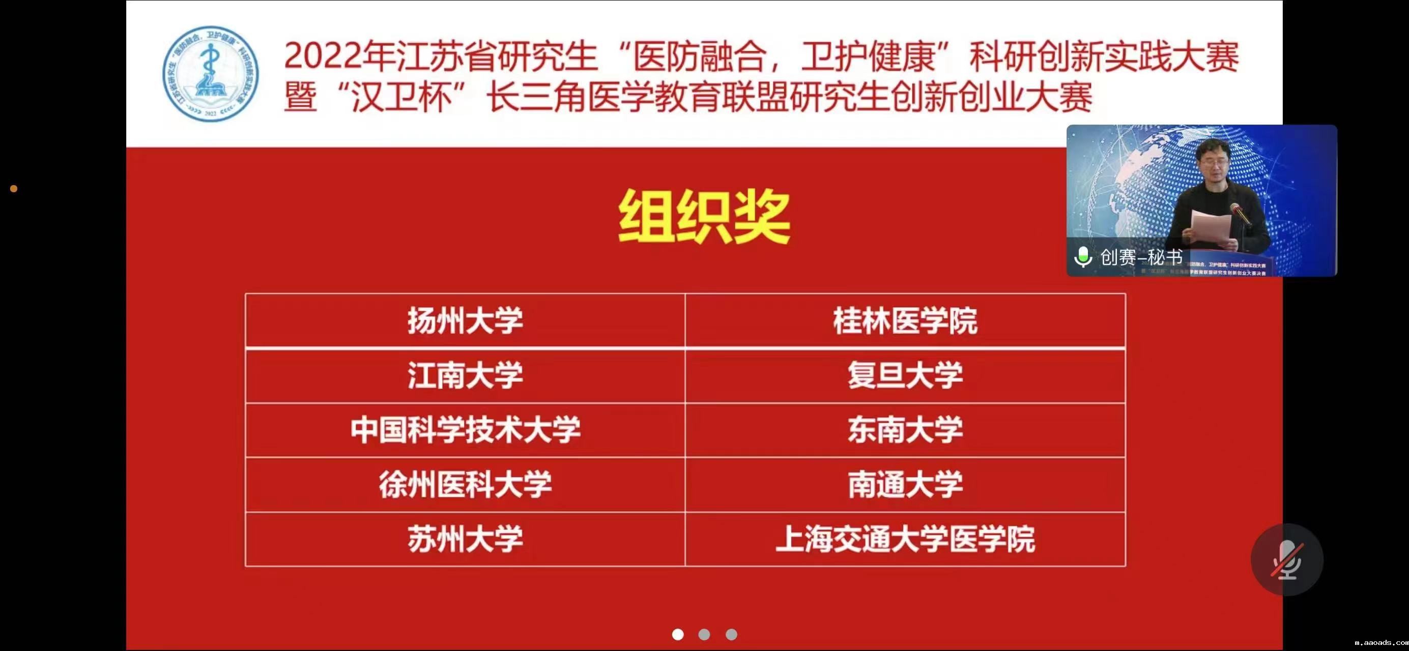 为紧密结合长三角地区经济社会发展和人民健康服务需要,引导青年学生从公共卫生与临床实践中提取“医防融合”关键问题,由江苏省研究生教育指导委员会、长三角医学教育联盟主办,南京医科大学承办的以“医防融合,卫护健康”为主题的2022年江苏省研究生科研创新实践大赛暨“汉卫杯”长三角医学教育联盟研究生创新创业大赛于2022年10月-12月举办。