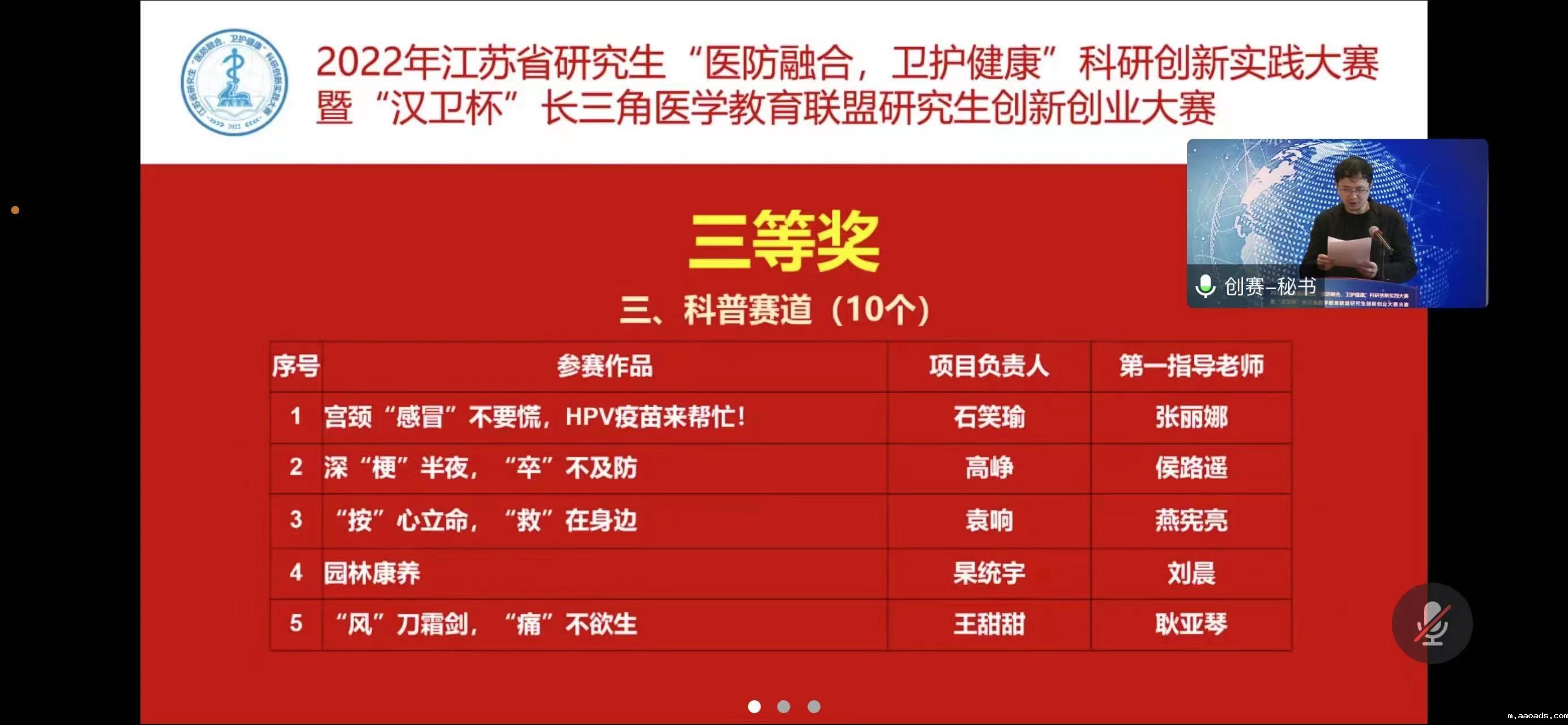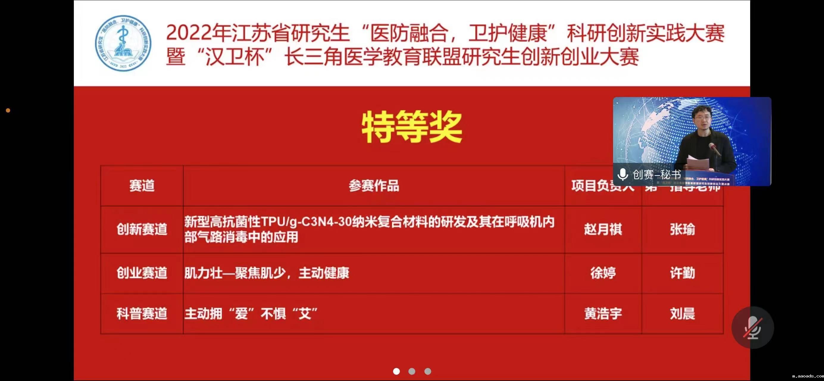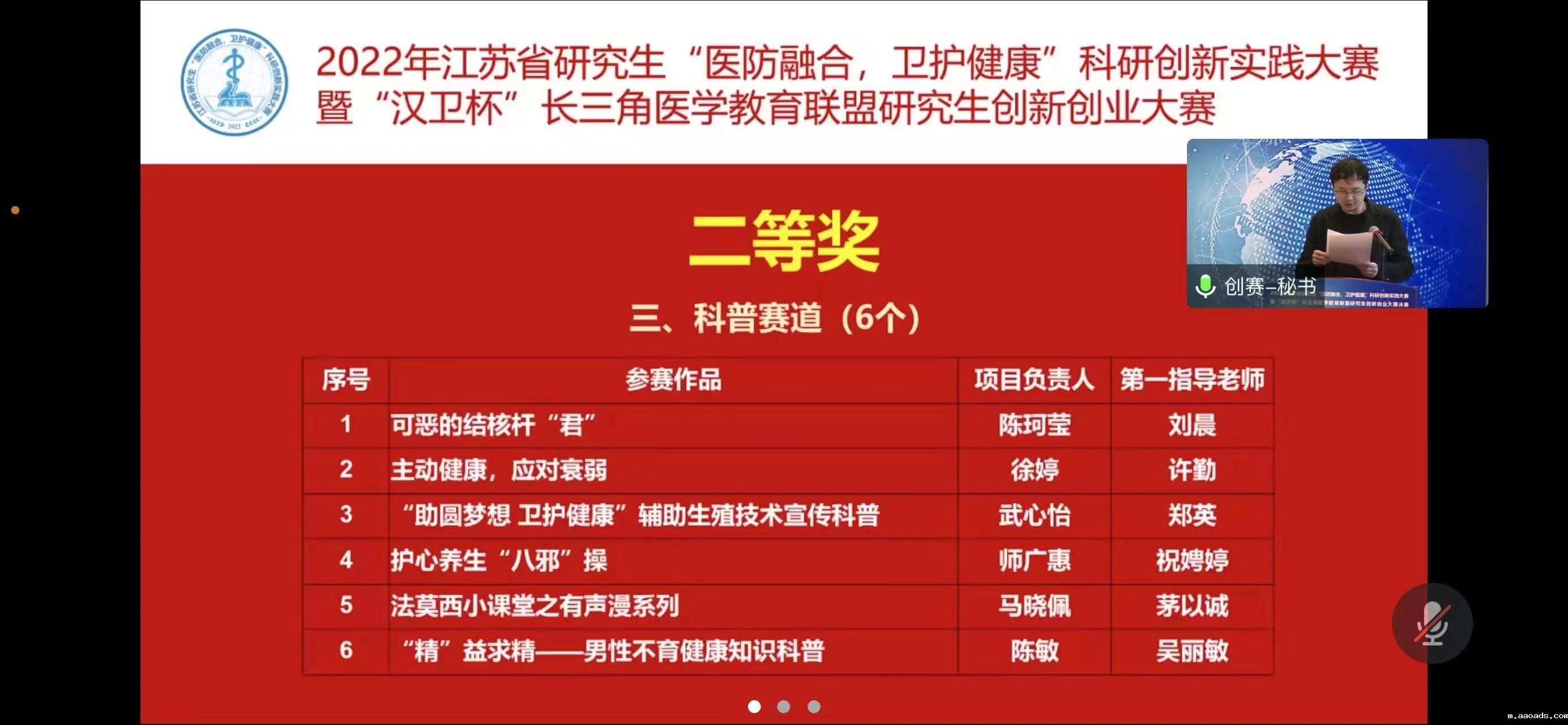 为紧密结合长三角地区经济社会发展和人民健康服务需要,引导青年学生从公共卫生与临床实践中提取“医防融合”关键问题,由江苏省研究生教育指导委员会、长三角医学教育联盟主办,南京医科大学承办的以“医防融合,卫护健康”为主题的2022年江苏省研究生科研创新实践大赛暨“汉卫杯”长三角医学教育联盟研究生创新创业大赛于2022年10月-12月举办。