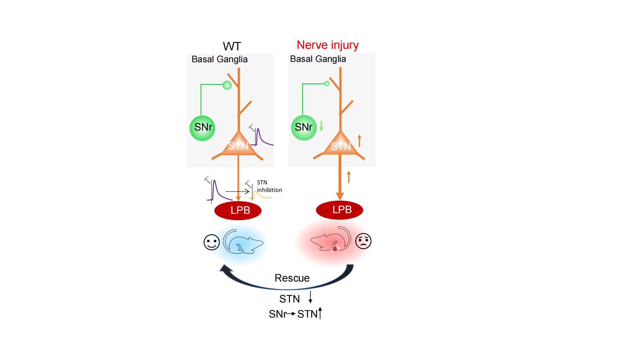 本文采用了顺向和逆向病毒示踪技术、光遗传学技术和脑片电生理技术明确了STN谷氨酸能神经元通过单突触联系支配外侧臂旁核(LPB)谷氨酸能神经元,而这些投射至LPB的STN神经元又受黑质网状区(SNr)GABA能神经元的支配。在慢性疼痛中,SNr-STN-LPB两级环路神经元兴奋性和突触联系发生了长期改变:SNr神经元兴奋性下降,STN神经元过度兴奋,STN-LPB谷氨酸能突触联系增强。 用光遗传学技术逆转这些改变可缓解急慢性疼痛模型小鼠痛觉敏感症状。总之,该研究阐明了STN神经元调控疼痛反应和参与慢性疼痛的上下游机制,为基底神经节调控疼痛传导通路提供了直接突触水平证据;对探索帕金森病患者疼痛防治策略也具有重要价值。