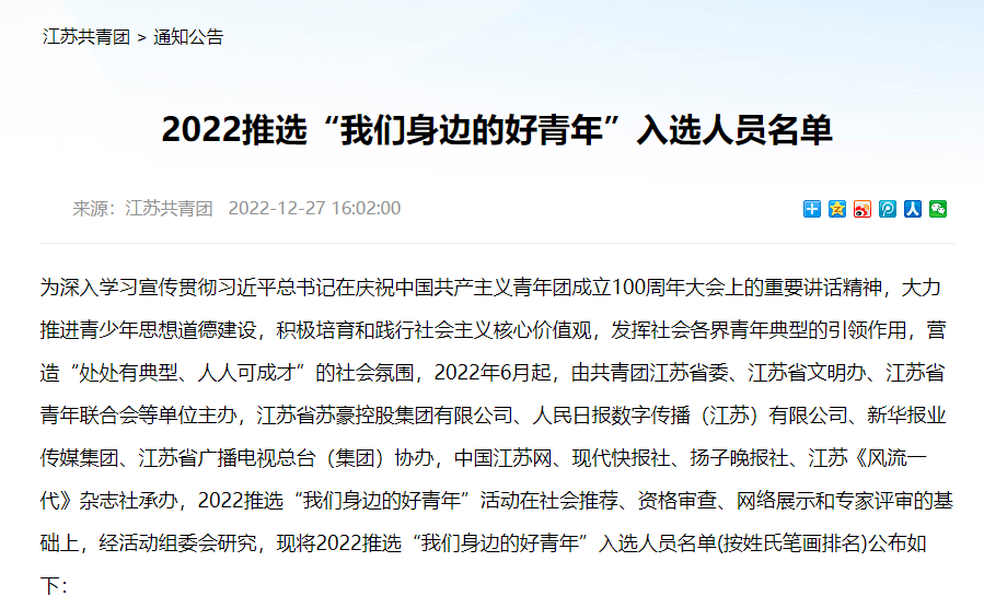 据悉,本届评选活动由共青团江苏省委、江苏省文明办、江苏省青年联合会等单位主办,江苏省苏豪控股集团有限公司、人民日报数字传播(江苏)有限公司、新华报业传媒集团、江苏省广播电视总台(集团)协办,中国江苏网、现代快报社、扬子晚报社、江苏《风流一代》杂志社承办,旨在深入学习宣传贯彻习近平总书记在庆祝中国共产主义青年团成立100周年大会上的重要讲话精神,大力推进青少年思想道德建设,积极培育和践行社会主义核心价值观,充分发挥社会各界青年典型的引领作用,营造“处处有典型、人人可成才”的社会氛围。