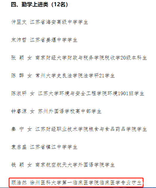 我校第一临床医学院学子顾浩然经过社会推荐、资格审查、网络展示和专家评审等环节,最终荣获2022年江苏省“我们身边的好青年”称号(勤学上进类,全省仅12名)。顾浩然同学脚踏实地,勤奋好学,多次获得校等级奖学金、“优秀学生干部”称号等荣誉。他潜心科研,积极参赛,以第一主持人负责大学生创新创业训练计划项目1项、申请实用新型专利2项,获全国大学生英语竞赛三等奖、全国大学生英语词汇能力大赛江苏赛区本科组特等奖等。同时积极参加各类社会实践及志愿服务活动,获南京市建邺区优秀抗疫志愿者、云龙湖"河小青"志愿之星等荣誉称号。