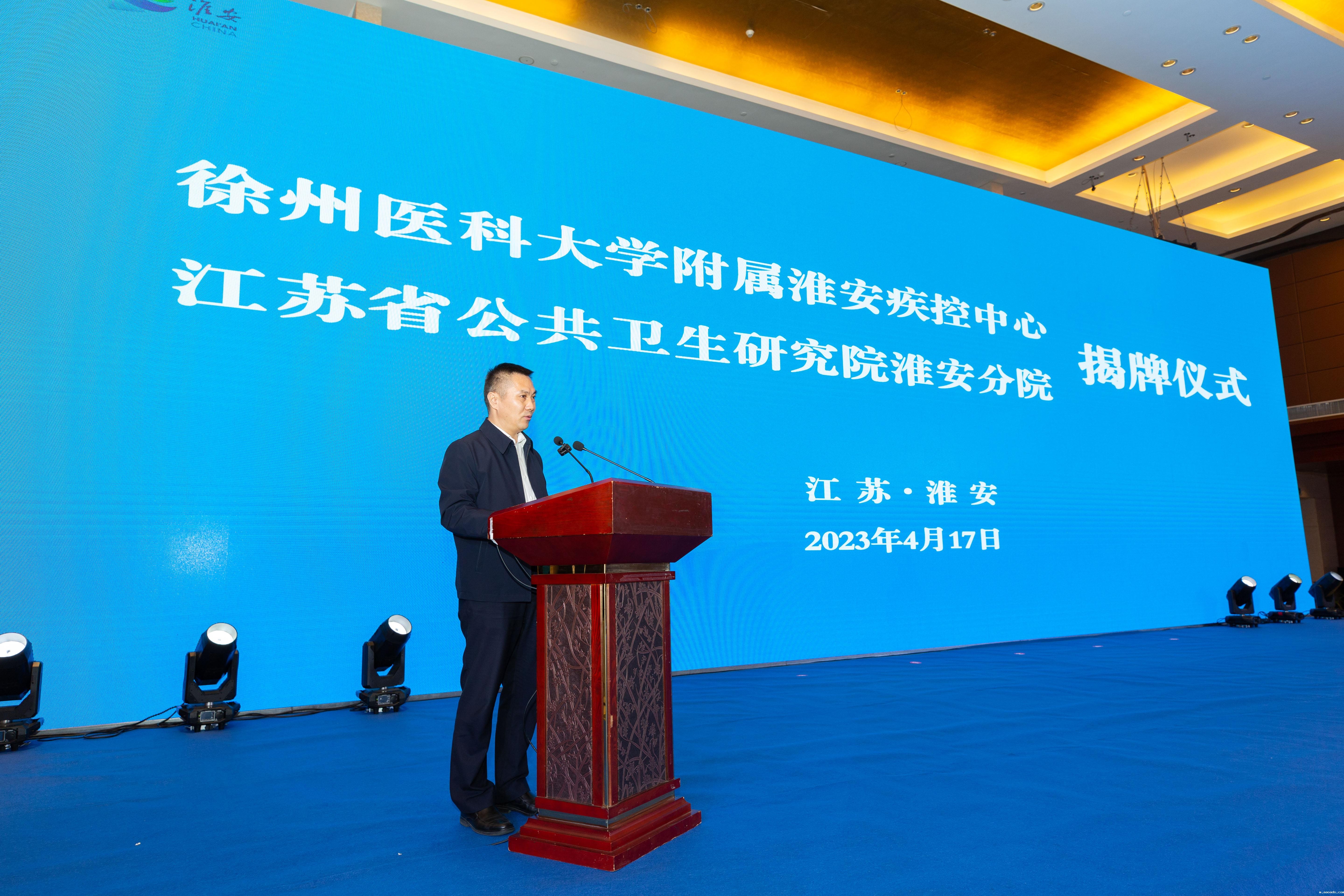 郑东辉致欢迎辞,他表示这是淮安市疾控中心发展史上的重要时刻,本次揭牌仪式将深化省市校地融合,助推校地发展。