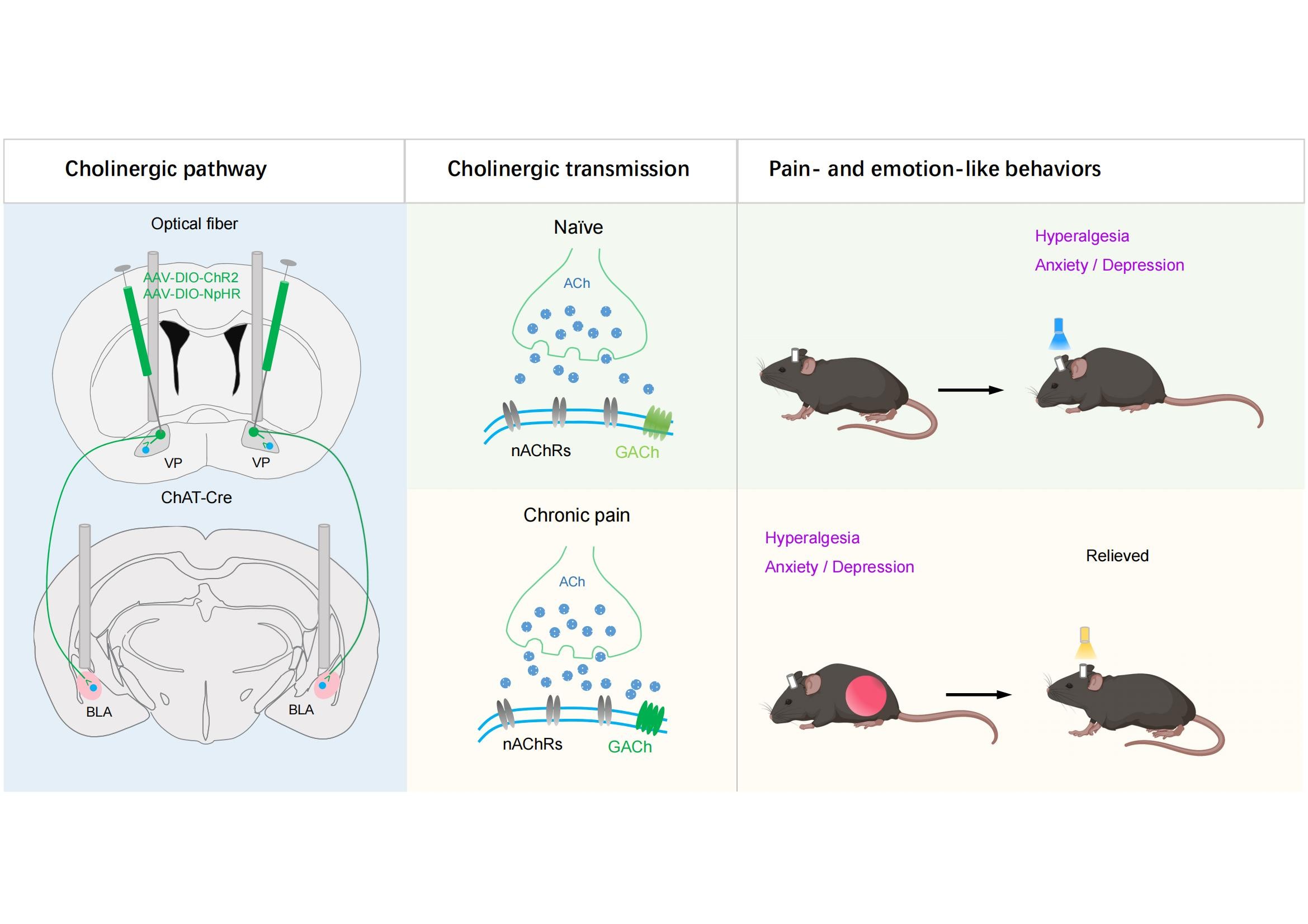 本研究证明了小鼠VP胆碱能神经元通过释放乙酰胆碱,激活尼古丁受体,而兴奋VP局部环路中的非胆碱能神经元,以及下游的基底外侧杏仁核(BLA)神经元。VP胆碱能神经元在急慢性疼痛刺激下放电增加,提高VP和BLA乙酰胆碱的释放,导致周围神经元的过度兴奋。光遗传学研究发现,兴奋VP胆碱能神经元及其向BLA的投射则可诱发痛觉过敏和焦虑抑郁样行为;抑制VP胆碱能神经元及其向BLA的投射则可缓解慢性神经病理性疼痛小鼠的痛觉过敏和焦虑抑郁样行为,但不影响慢性应激小鼠模型的焦虑和抑郁样行为;间歇性反复光遗传学调控VP胆碱能神经元和VP-BLA胆碱能通路足以产生对小鼠焦虑和抑郁样行为的中长期调节效应,但持续调控这一通路才能改变小鼠的痛觉阈值。本研究证实了VP胆碱能神经元在急慢性疼痛发生发展中的重要作用,提示VP和BLA中的尼古丁受体可能是针对慢性疼痛患者痛觉过敏和焦虑抑郁样症状的有效治疗靶点。