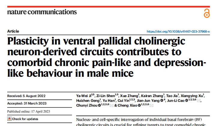 我校江苏省麻醉学重点实验室肖诚、周春艺和曹君利教授团队合作,在慢性疼痛-抑郁共病的胆碱能机制方面获得重要进展,研究成果“Plasticity in ventral pallidal cholinergic neuron-derived circuits contributes to comorbid chronic pain-like and depression-like behaviour in male mice”于今年4月17日在线发表在综合类Top期刊Nature Communications(自然指数期刊)上。肖诚、周春艺和曹君利教授为本文的通讯作者,郑州大学第一附属医院杨建军教授为课题设计的改进提出了宝贵意见。博士研究生纪雅炜和硕士研究生沈子琳为本文的共同第一作者,博士研究生张雪、贾弢和许祥影,硕士研究生张凯然、耿会珍和韩宇,以及尹翠老师也作出了重要贡献。