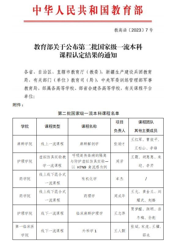 近日,教育部公布第二批国家级一流本科课程认定结果,我校《麻醉解剖学》等6门课程入选国家级一流本科课程,包括线上一流课程1门、线下一流课程2门、线上线下混合式一流课程2门、虚拟仿真实验教学一流课程1门。一流本科课程建设是教育部坚持立德树人根本任务,深化高等教育教学改革,提高人才培养质量的重要举措。根据《教育部关于一流本科课程建设的实施意见》和《教育部办公厅关于开展第二批国家级一流本科课程认定工作的通知》精神,我校紧紧围绕立德树人根本任务,统筹推进课程建设工作,逐步构建起“国家-省-校”三级一流课程建设体系,为提升学校人才培养质量奠定坚实的基础。