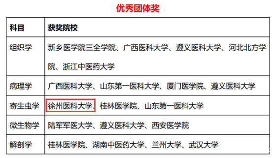 在本次比赛中,我校获奖数为28人次,占我校参加总参赛人次的18.67%。其中,组织学获一等奖1项、二等奖1项、三等奖3项;病理学获一等奖1项、三等奖3项;寄生虫学获一等奖2项、二等奖3项、三等奖5项;病原微生物学获一等奖1项、三等奖4项;人体解剖学获二等奖3项、三等奖1项。我校寄生虫学科平均成绩排名较高,荣获“优秀团体奖”;同时,我校因成绩优异且组织有序,荣获“优秀组织奖”。