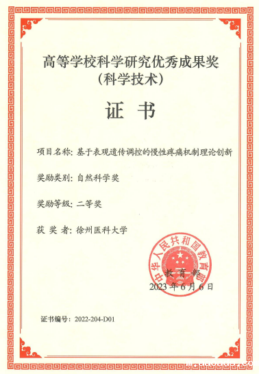 近日,教育部高等学校科学研究优秀成果奖获奖结果公布并颁发证书,我校麻醉学院曹君利教授团队“基于表观遗传调控的慢性疼痛机制理论创新”项目荣获自然科学二等奖(获奖人:曹君利、潘志强、周成华、印晓星、张铭、薛洲亚、朱丽娇、李国芳、郝凌云)。该研究成果奖由麻醉学院和药学院联合申报。