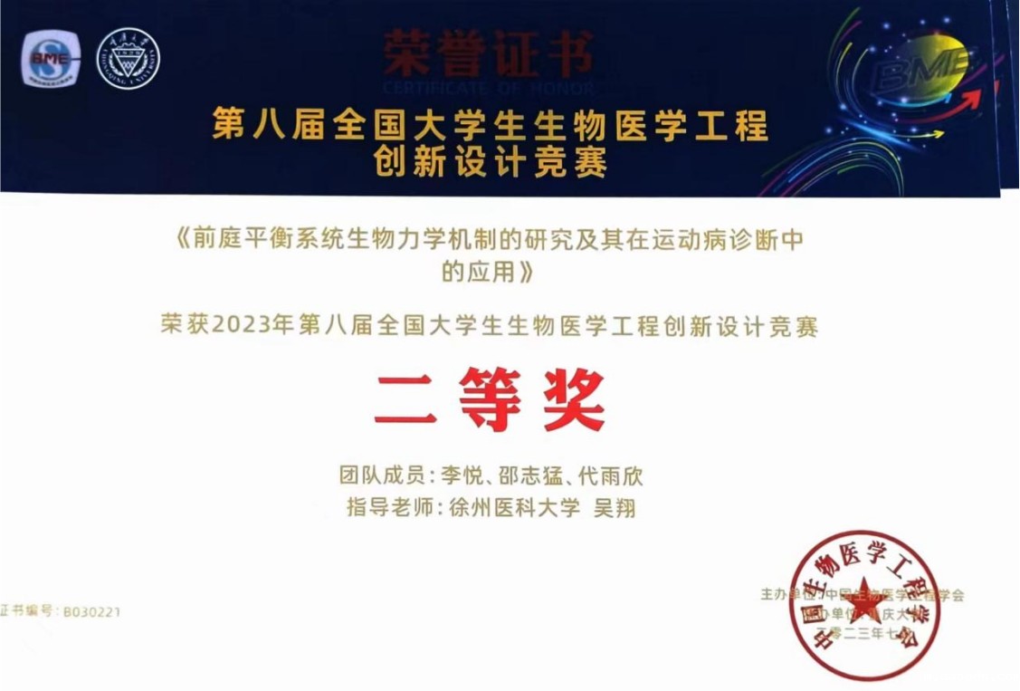 在决赛现场赛中,我校参赛作品“基于肿瘤氧供策略在磁共振成像引导下声动力/化学动力学协同治疗三阴性乳腺癌研究”(指导老师:时梅林)获得国赛一等奖;“基于碳纳米管及AS1411摩擦电传感芯片的循环肿瘤细胞无创检测系统设计”(指导老师:陈明慧)、“前庭平衡系统生物力学机制的研究及其在运动病诊断中的应用”(指导老师:吴翔)2个项目获得国赛二等奖。