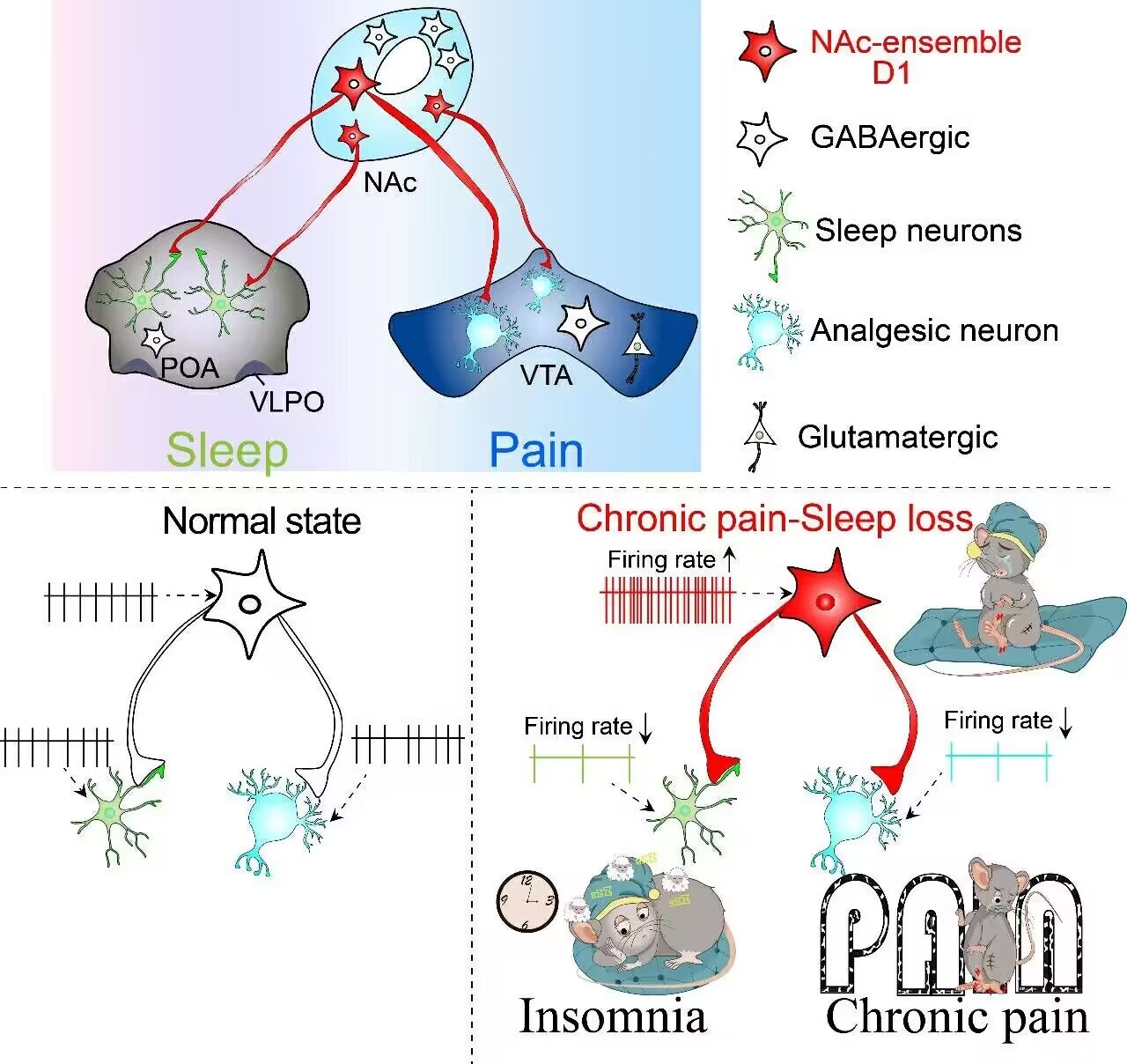 研究结论模式图:伏隔核神经元集群分别投射至视前区(调控睡眠的关键脑区)和腹侧被盖区(调控疼痛)。在生理状态下,伏隔核神经元集群放电正常,维持正常的睡眠/觉醒行为及痛觉感应。而在慢性疼痛或失眠病理状态下,这群神经元异常兴奋,过度抑制视前区睡眠神经元和腹侧被盖区镇痛神经元,从而导致慢性疼痛和失眠共病,且形成恶性循环。