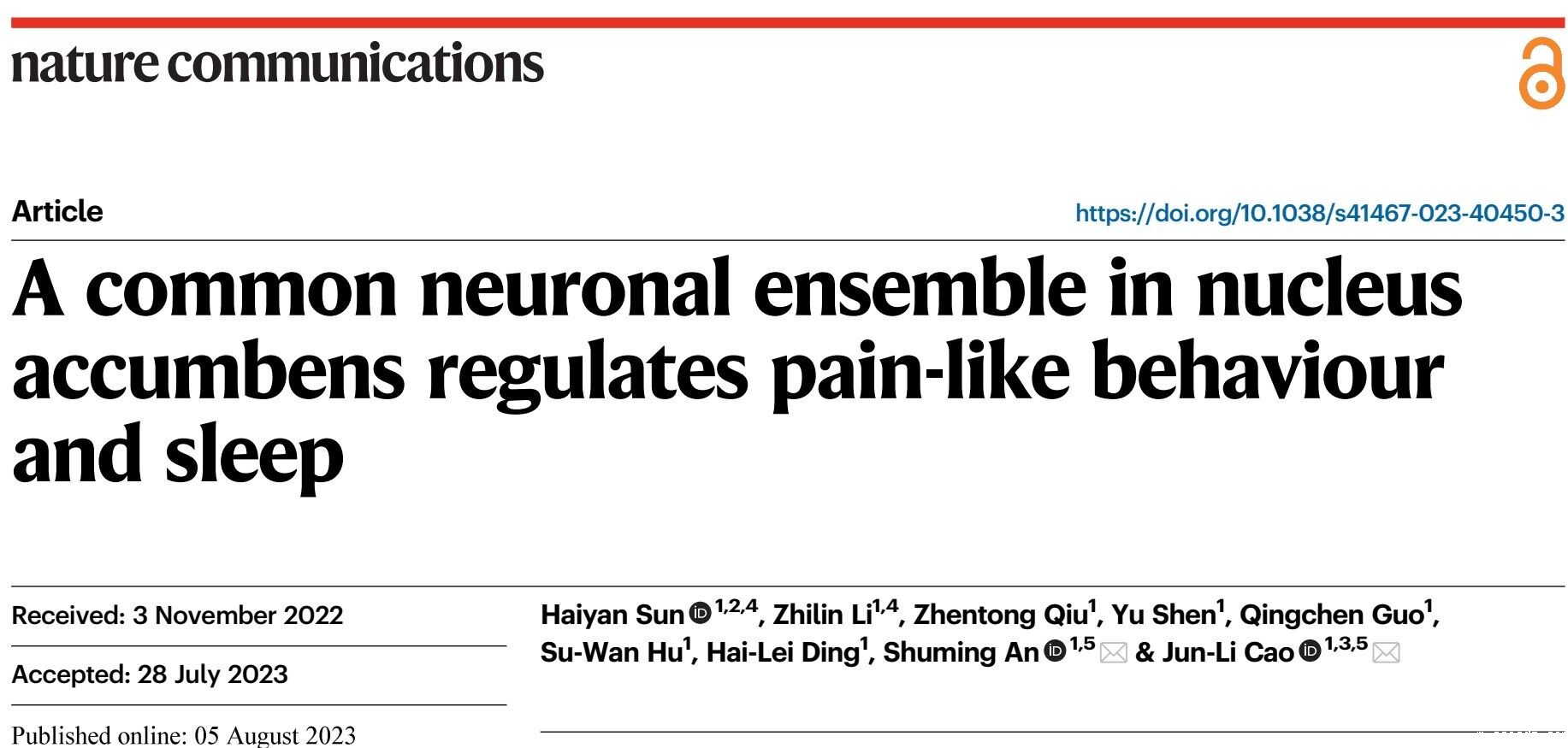 8月5日,江苏省麻醉学重点实验室/江苏省麻醉与镇痛应用科技重点实验室曹君利、安述明教授课题组在Nature Communications(综合性期刊1区,Top 期刊,自然指数期刊)杂志发表最新研究成果,揭示了伏隔核神经元集群介导慢性疼痛-睡眠障碍共病的神经机制-“A common neuronal ensemble in nucleus accumbens regulates pain-like behaviour and sleep”。该研究由第一临床医学院儿科学教研室孙海艳博士和麻醉学重点实验室硕士生李峙林为共同第一作者,麻醉学重点实验室曹君利教授和安述明教授为共同通讯作者。硕士研究生邱帧童、申宇,胡苏皖、郭庆臣博士,丁海雷教授也作出了重要贡献。