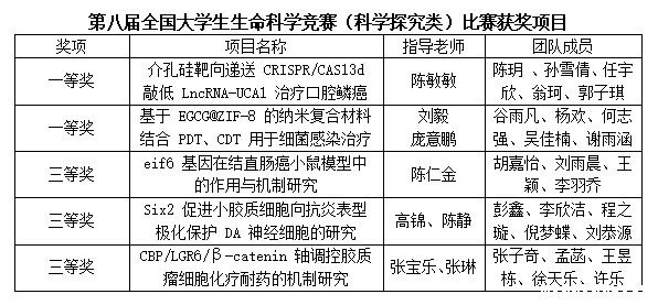 凭借着各团队的优异表现,药学院《基于拉曼光谱指纹图谱和机器学习对不同物种来源糖原分析和鉴定》(指导教师:王亮、张潇)、麻醉学院《AgloVision——镇痛镇静双指标的麻醉深度预测技术》(指导教师:张咏梅)、生命科学学院《免疫系统人源化小鼠:现代医学治疗领域的技术助推者》(指导教师:陈仁金、朱慕春)、药学院《异质型循环肿瘤细胞同步捕获、鉴别和检测一体化研究》(指导教师:于妍妍、李成林)、医学信息与工程学院《Brain Clear阿尔兹海默症早期智能筛查开拓者》(指导教师:张然、任鹏)等5个项目荣获创新创业类国赛一等奖;口腔医学院《介孔硅靶向递送 CRISPR/CAS13d 敲低 LncRNA-UCA1 治疗口腔鳞癌》(指导教师:陈敏敏)、生命科学学院《基于 EGCG@ZIF-8 的纳米复合材料结合 PDT、CDT 用于细菌感染治疗》(指导教师:刘毅、庞意鹏)等2个项目荣获科学探究类国赛一等奖。