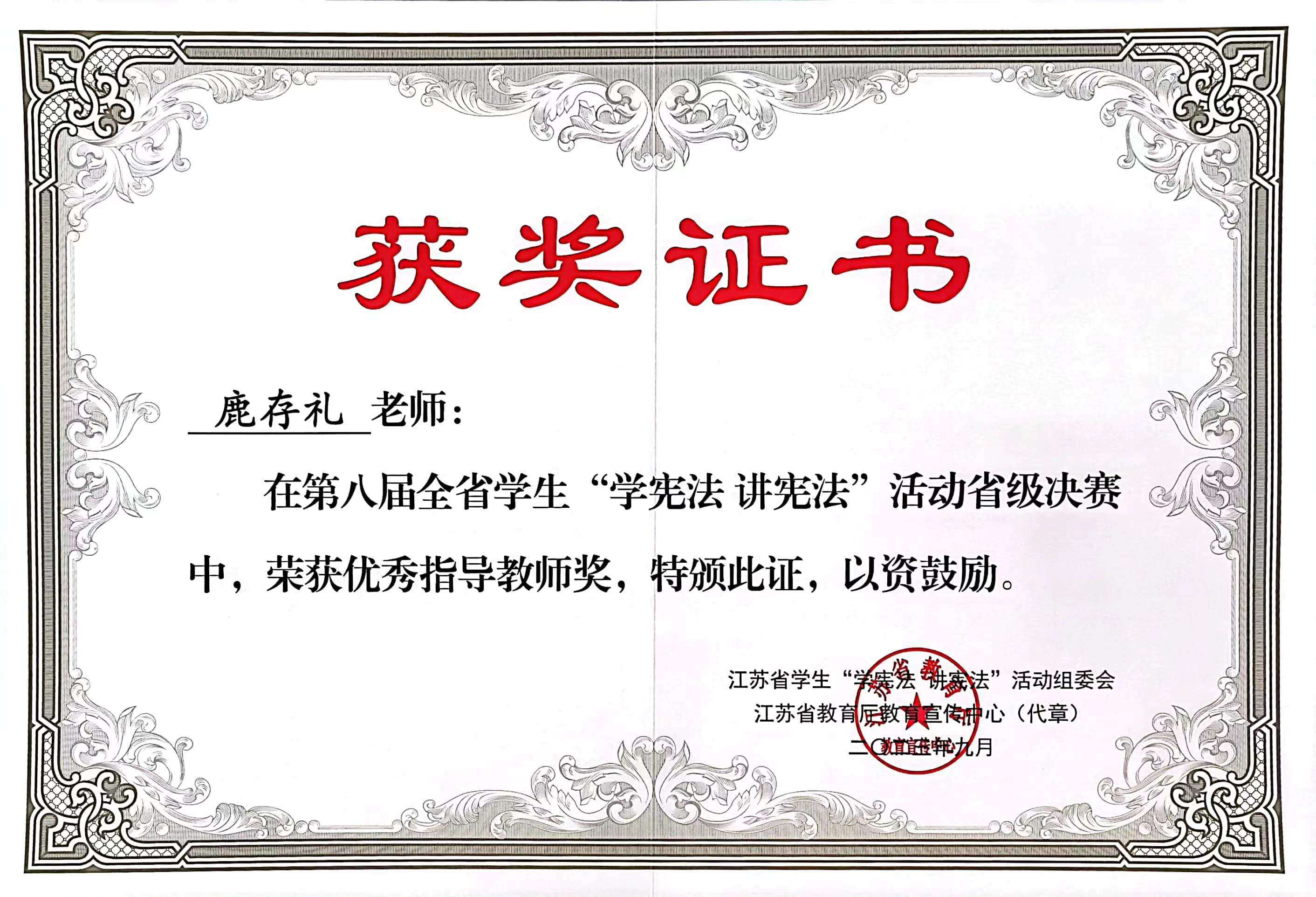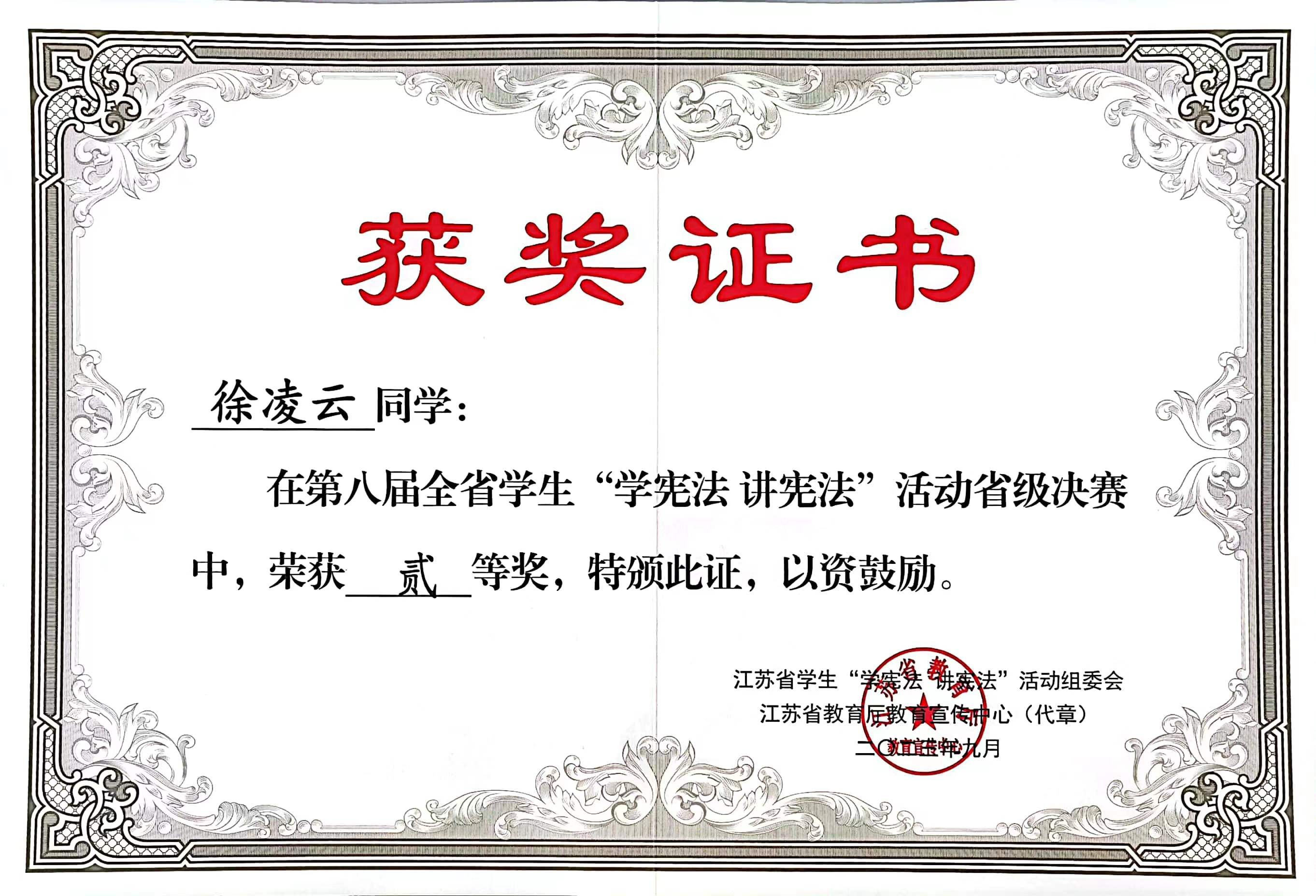 9月24日,江苏省教育厅举办的第八届全省学生“学宪法 讲宪法”活动落下帷幕,全省共93所高校的选手参加此次活动,我校医学影像学院学生徐凌云获演讲比赛(高校组)二等奖,鹿存礼老师获“优秀指导老师”荣誉。