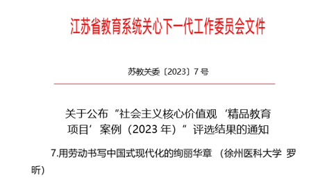 近日,由江苏省教育系统关工委主办的社会主义核心价值观“精品教育项目”案例(2023年)评选活动结果公布。我校马克思主义学院罗昕老师主讲的作品《用劳动书写中国式现代化的绚丽华章》荣获二等奖。