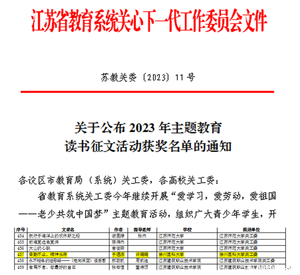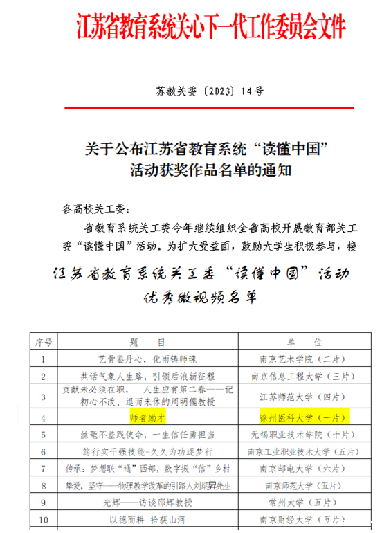 近日,江苏省教育系统关工委发布《关于公布江苏省教育系统“读懂中国”活动获奖作品名单的通知》和《关于公布2023年主题教育读书征文活动获奖名单的通知》,我校麻醉学院关工委报送的《师者励才》获评“读懂中国”活动优秀微视频,口腔医学院于通源同学撰写的《辛勤不止,精神长存》获评主题教育读书征文活动三等奖。