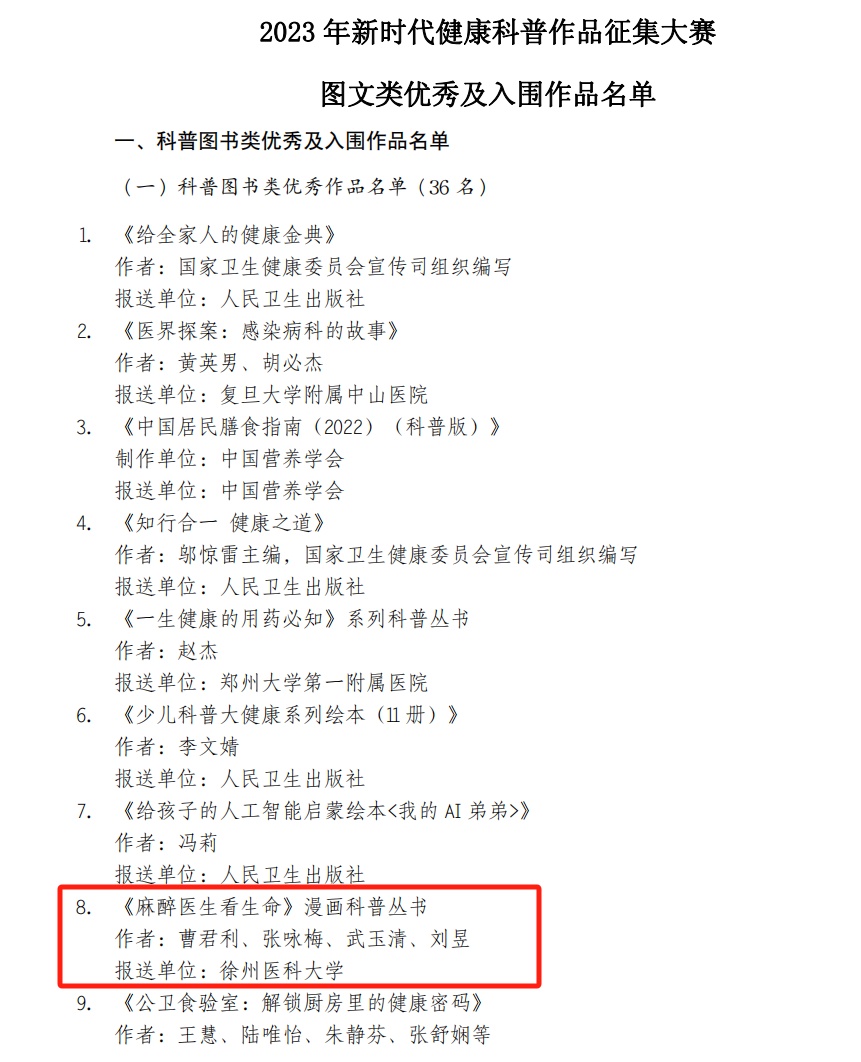 近日,国家卫生健康委、科技部、国家中医药局、国家疾控局、中国科协共同组织开展了“健康知识普及行动—2023年新时代健康科普作品征集大赛”。经过省级初审、推荐,各类别专家组复审、终审,麻醉学院报送的《麻醉医生看生命》漫画科普丛书最终脱颖而出,获得科普图书类优秀作品(全国共遴选36项)。