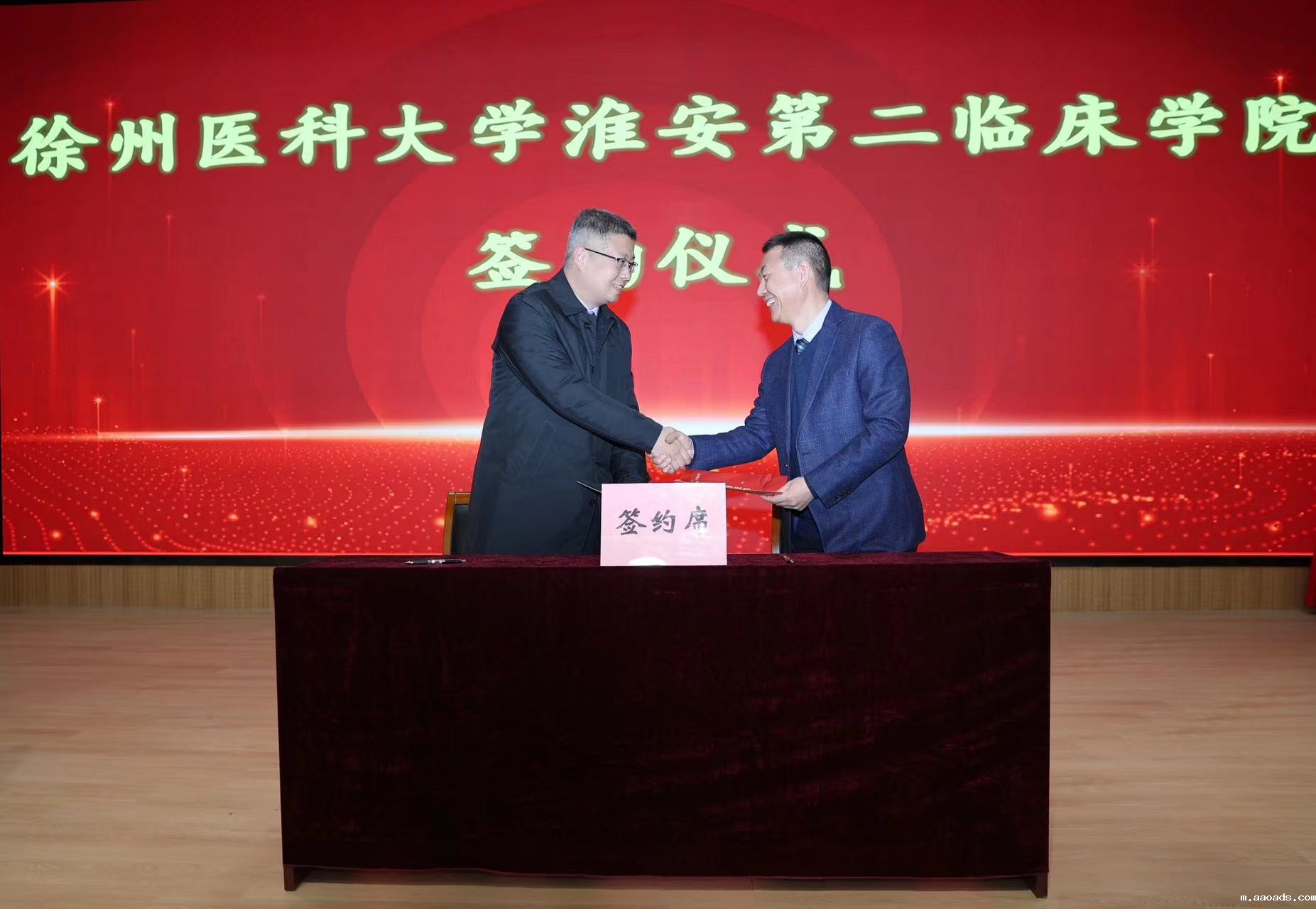 郭栋与秦孝峰共同签署临床学院合作协议。随后,徐海波、郭栋、郑东辉、范智勇共同为伟德客户端下载安装手机版淮安第二临床学院揭牌。