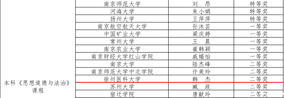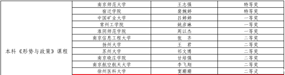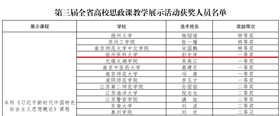 近期,江苏省教育厅公布了第三届全省高校思政课教学展示活动获奖名单,马克思主义学院赵光侠老师荣获《习近平新时代中国特色社会主义思想概论》课程组一等奖,韩杰老师荣获《思想道德与法治》课程组二等奖,窦珊珊老师荣获《形势与政策》课程组二等奖。其中,赵光侠老师入围第四届全国高校思政课教学展示活动人员推荐名单。