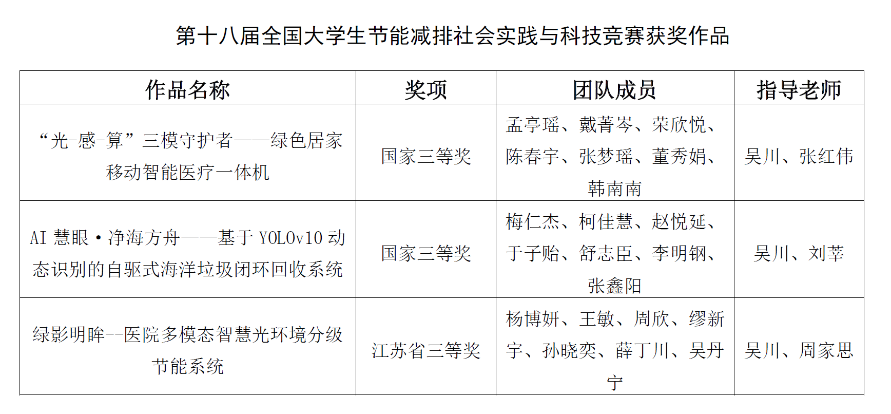 近日,第十八届全国大学生节能减排社会实践与科技竞赛决赛圆满落幕。我校在本届竞赛中表现优异,由医学信息与工程学院吴川、张红伟、刘莘等老师指导的两支团队均荣获国家级三等奖,我校荣获“江苏省优秀组织奖”。