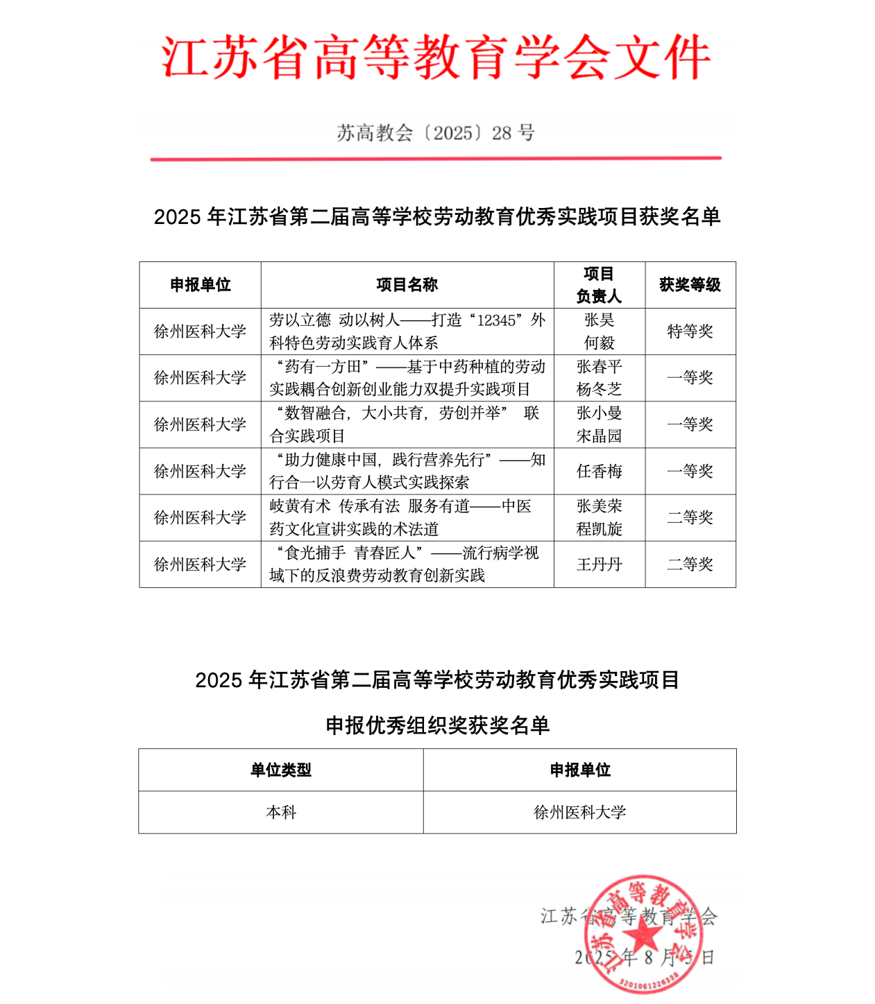 近日,江苏省高等教育学会公布了2025年江苏省第二届高等学校劳动教育优秀实践项目评选结果,我校凭借扎实的劳动教育实践成果和优秀的组织工作,共斩获6个奖项,包括特等奖1项、一等奖3项、二等奖2项,并再次荣获"优秀组织奖"称号。其中,张昊和何毅老师的《劳以立德 动以树人——打造“12345”外科特色劳动实践育人体系》项目获得特等奖,张春平和杨冬芝老师的《“药有一方田”——基于中药种植的劳动实践耦合创新创业能力双提升实践项目》、张小曼和宋晶园老师的《“数智融合,大小共育,劳创并举”联合实践项目》、任香梅老师的《“助力健康中国,践行营养先行”——知行合一以劳育人模式实践探索》项目获得一等奖,张美荣和程凯旋老师的《岐黄有术 传承有法 服务有道——中医药文化宣讲实践的术法道》、王丹丹老师的《“食光捕手 青春匠人”——流行病学视域下的反浪费劳动教育创新实践》项目获得二等奖。