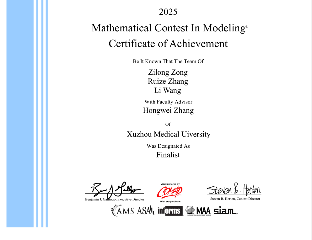 近日,2025年美国大学生数学建模竞赛成绩公布,由医学信息与工程学院张红伟老师指导的22本计科专业张锐泽、21本口腔专业宗子龙和23本管理专业王丽同学组成的团队在本届竞赛中斩获特等提名奖(Finalist),这是我校学子在此项国际顶级赛事中取得的最高级别奖项。管理学院温宗良老师指导学生团队获得二等奖3项。