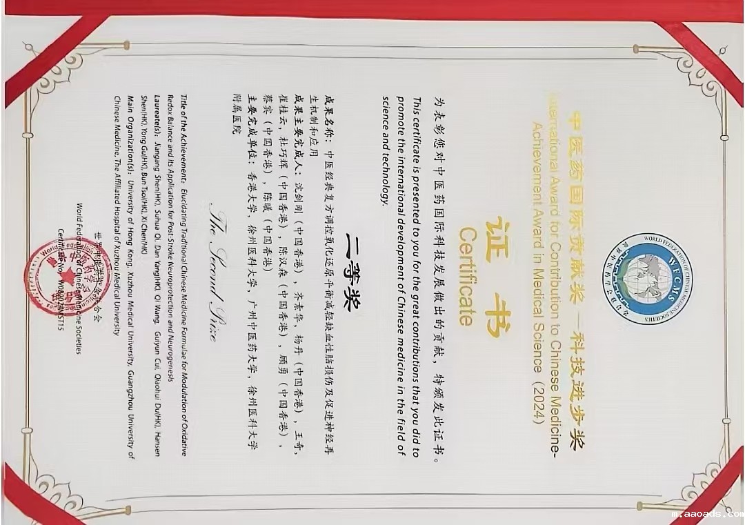 近日,我校医学技术学院齐素华教授团队与香港大学沈剑刚教授团队合作的科研项目《中医药调控氧化还原平衡减轻缺血性脑损伤及促神经再生机制和应用》荣获2024年度中医药国际贡献奖——科技进步二等奖(伟德客户端下载安装手机版排名第二,香港大学排名第一)。该奖项目前是中医药领域的最高奖项,标志着我校在中医药治疗脑卒中领域取得重大成果,也展现了我国在治疗脑卒中领域的领先地位。